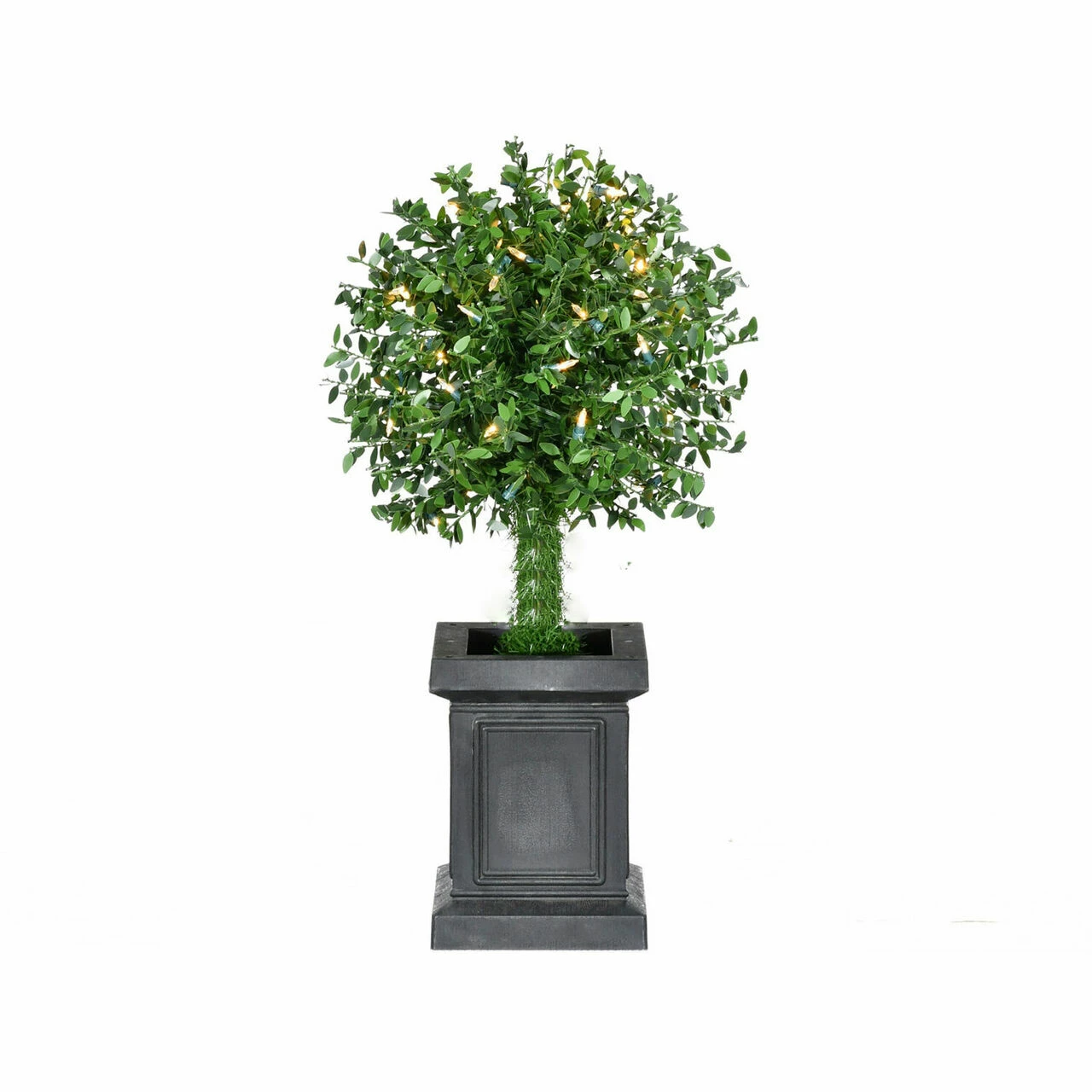 Make a statement with this 2-ft Boxwood topiary ball in a black pot from Fraser Hill Farm. Featuring lifelike foliage and all-metal structure for strength and durability, this modern topiary is specially crafted using the finest materials to look realistic and provide you with many seasons of use and enjoyment. The boxwood leaves are constructed from non-allergenic and flame-retardant materials then painted multiple hues of green so no two are exactly alike. Together these details create the look of a natural shrub that requires hardly any maintenance. Prestrung with 50 warm white LED lights, use this beautiful topiary as an alternative Christmas tree and decorate with ornaments, or keep it up year round as a funky accent piece. Place one in a corner for a lovely pop of green or buy two to frame a door, entryway, or fireplace. If you love a classic boxwood but do not want the maintenance, this is for you. Simply turn on and display – no clipping or watering required!