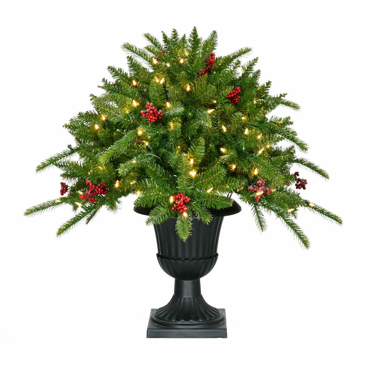Spruce up your holiday decor with this 2-ft. porch tree from Fraser Hill Farm. Featuring lifelike foliage and all-metal structure for strength and durability, this classic tree is specially crafted using the finest materials to look realistic and provide you with many seasons of use and enjoyment. The branches are constructed from non-allergenic and flame-retardant materials then painted multiple hues of green so no two are exactly alike. Red berries and 100 warm white LED lights accent the branches to create the look of a festive shrub that requires hardly any maintenance. Place one in a corner for a lovely pop of green or buy two to frame a door, entryway, or fireplace. If you love Christmas plants but do not want the maintenance, this is for you. Simply turn on and display – no clipping or watering required!