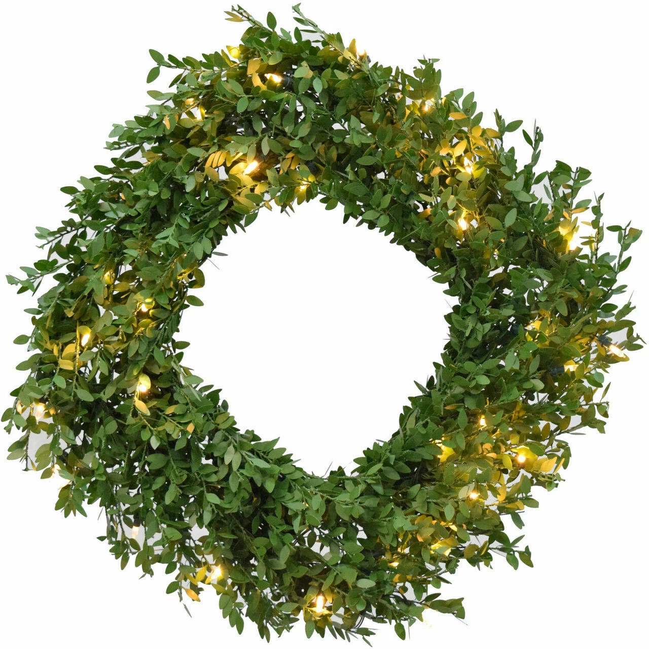 Spruce up your holiday decor with an artificial Boxwood wreath from Fraser Hill Farm. Whether you deck the halls indoors or outdoors, invest in a quality wreath that will last year after year. This all-season wreath features tiny, lifelike boxwood leaves arranged in a square to resemble real branches found in nature. Its pre-strung with battery-operated string lights that add a sparkle and charm to the overall display. Theres plenty of room for you to customize the look with bows, ornaments, and other decor from season to season, year round. If you love a classic boxwood that will last year after year – this wreath is for you.