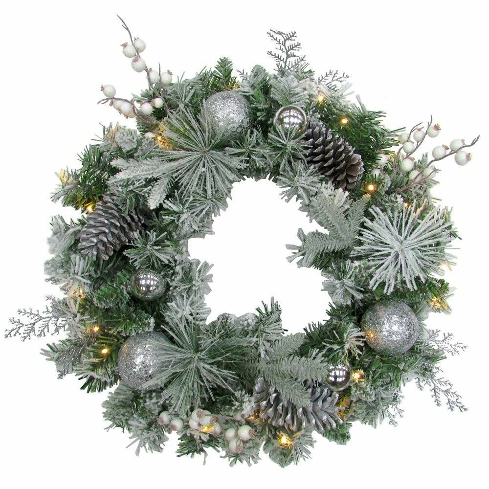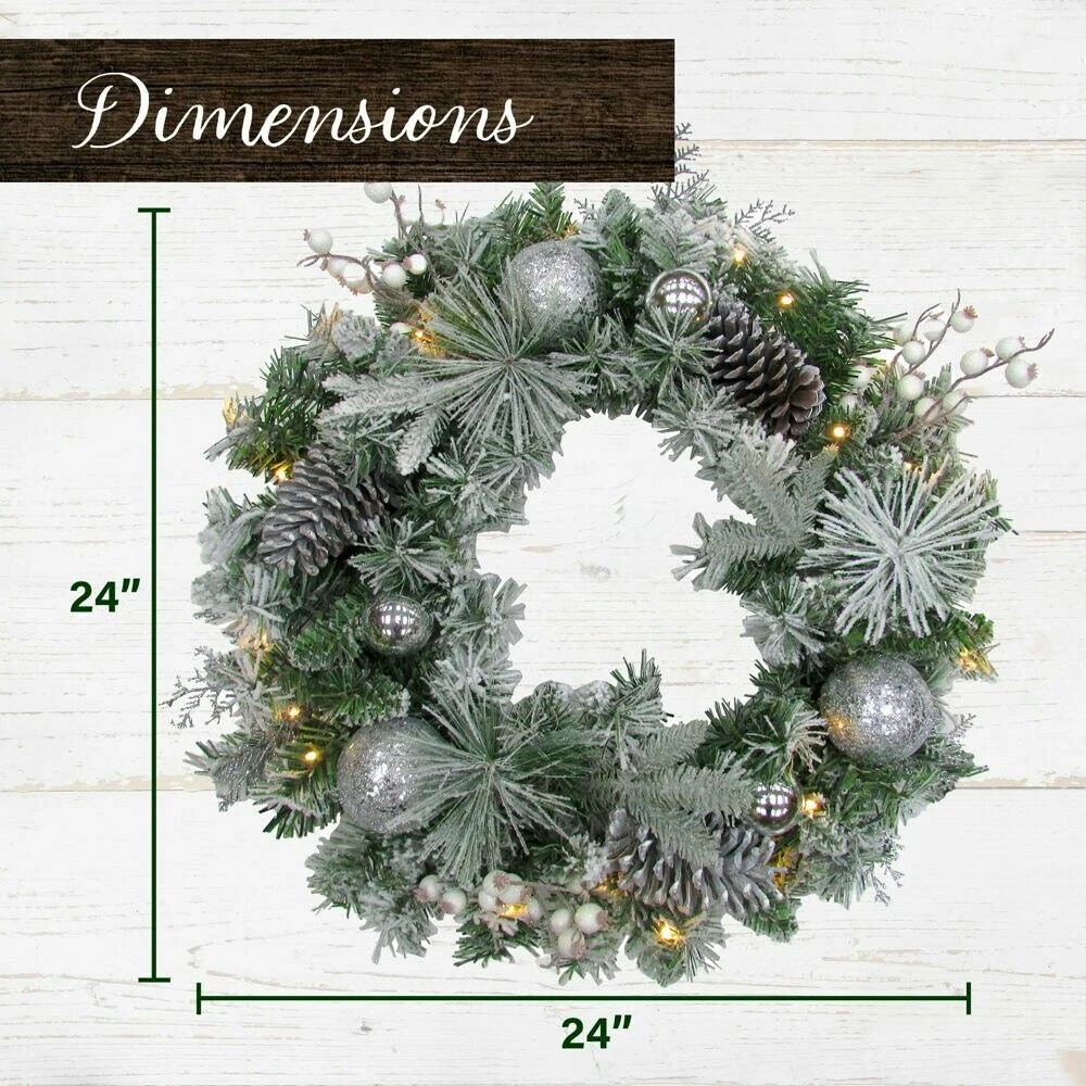 Spruce up your holiday decor with a 24-inch round artificial wreath from Fraser Hill Farm. Whether you deck the halls indoors or outdoors, invest in a quality wreath that will last year after year. This wreath features a mix of realistic pine branches with pine cones, winter berries, and ornaments scattered throughout. A dusting of flocked snow glistens among the silver finish of the ornaments while 25 prestrung, timer-operated LED lights twinkle in the twilight. The arrangement creates a complete look while evoking subtle feelings of Christmas. This wreath is coveted for its delightful arrangement of realistic branches, rustic charm, and festive accents to complete the look.
