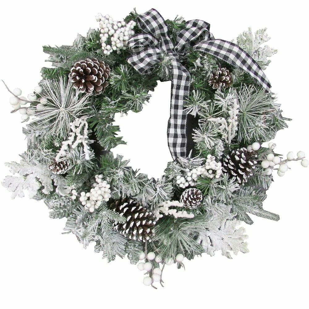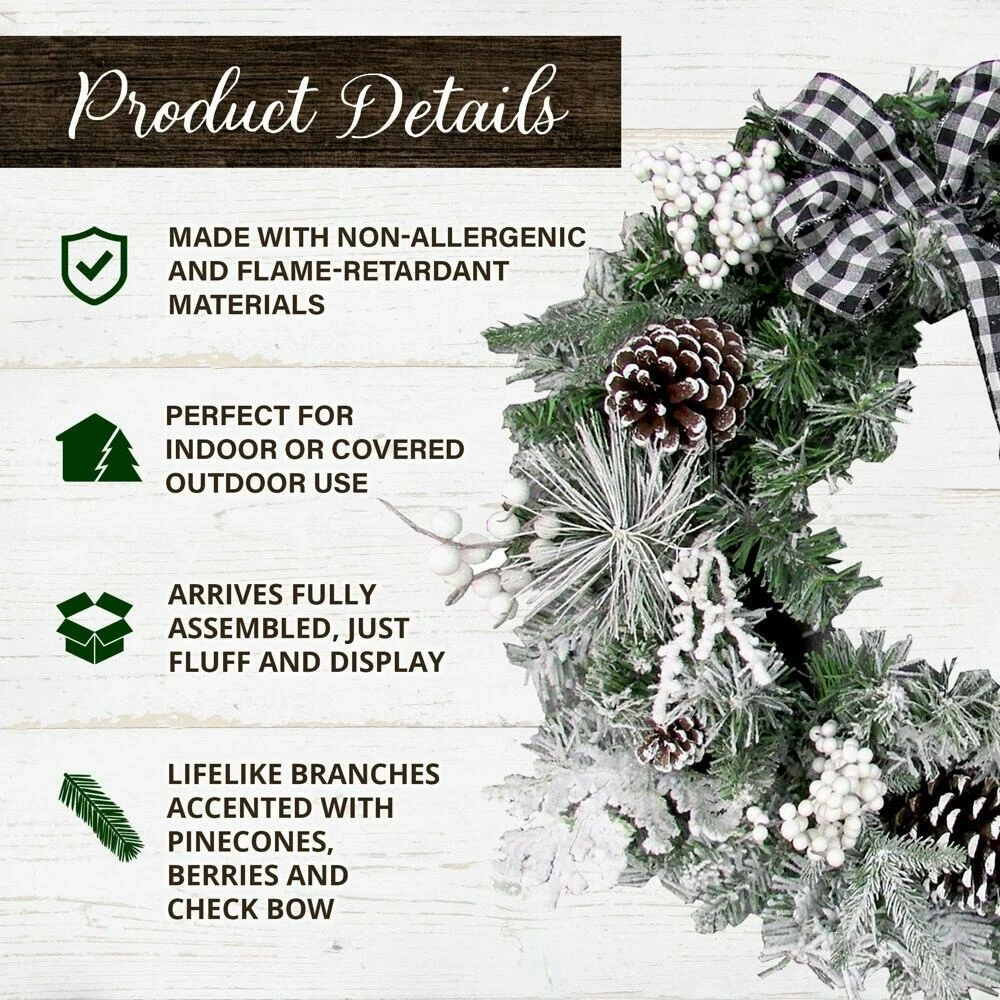 Spruce up your holiday decor with a 24-inch round artificial wreath from Fraser Hill Farm. Whether you deck the halls indoors or outdoors, invest in a quality wreath that will last year after year. This wreath features lifelike needles that resemble natural, evergreen branches, bringing all the realistic charm of a live wreath, but durable enough for years of continued use. Made with flame-retardant and non-allergenic materials, this Christmas classic is the perfect alternative to the real thing. The snow-covered arrangement is accented with festive details like white berries, pinecones and a black and white check bow. Hang this wreath on your door to welcome each guest with cheer that will last from one holiday season to the next.