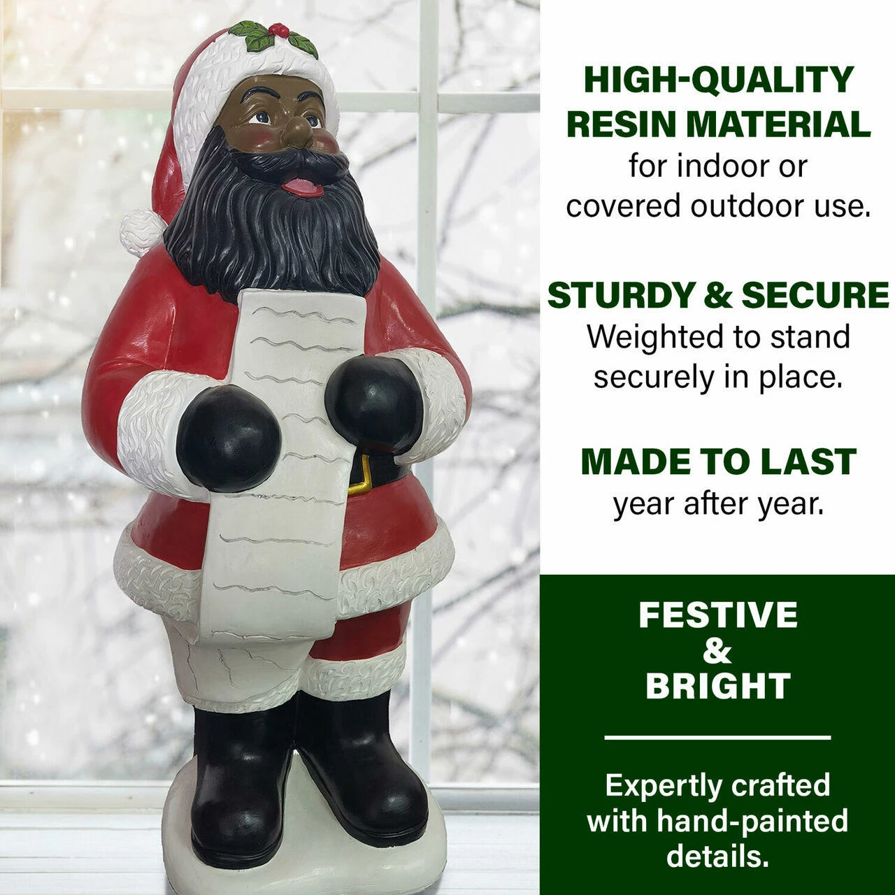 Capture the beauty, magic, and wonder of the holiday season with oversized resin decor from Fraser Hill Farm. Perfect for either indoor or covered outdoor use, our collection of resin statues will help you create a festive display that’s sure to impress friends, family, and carolers alike. Each intricately detailed item is crafted from weather-resistant resin then brightly hand-painted. Ho! Ho! Ho! Here comes Santa! Dressed in his famous red suit, our 36-inch tall African American Santa Claus is holding his Naughty & Nice List, and he’s checking it twice! This jolly Santa will add a special touch to your porch, entryway, fireplace hearth, or near the tree. For irresistibly unique decor that celebrates the spirit of Christmas, count on quality products from Fraser Hill Farm.