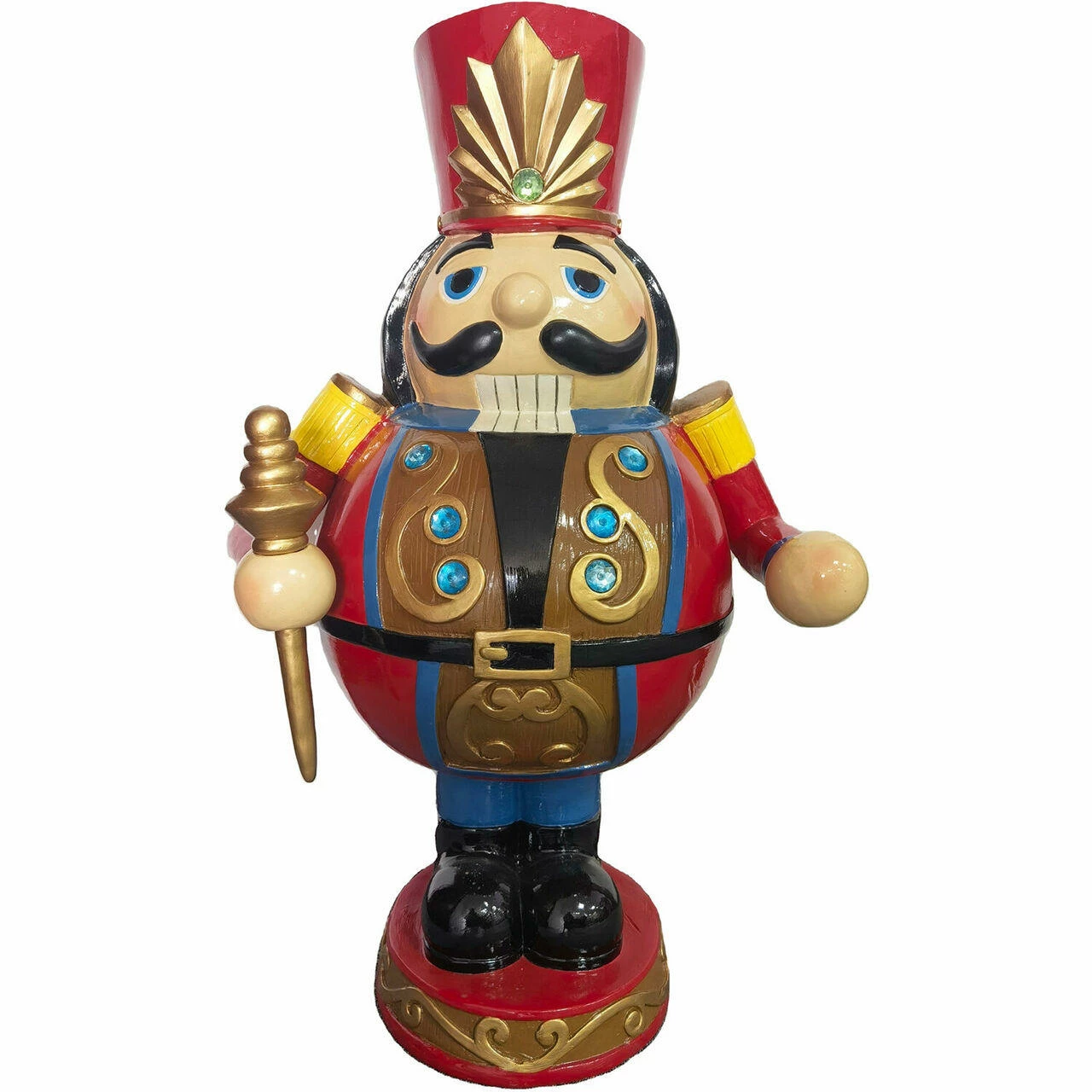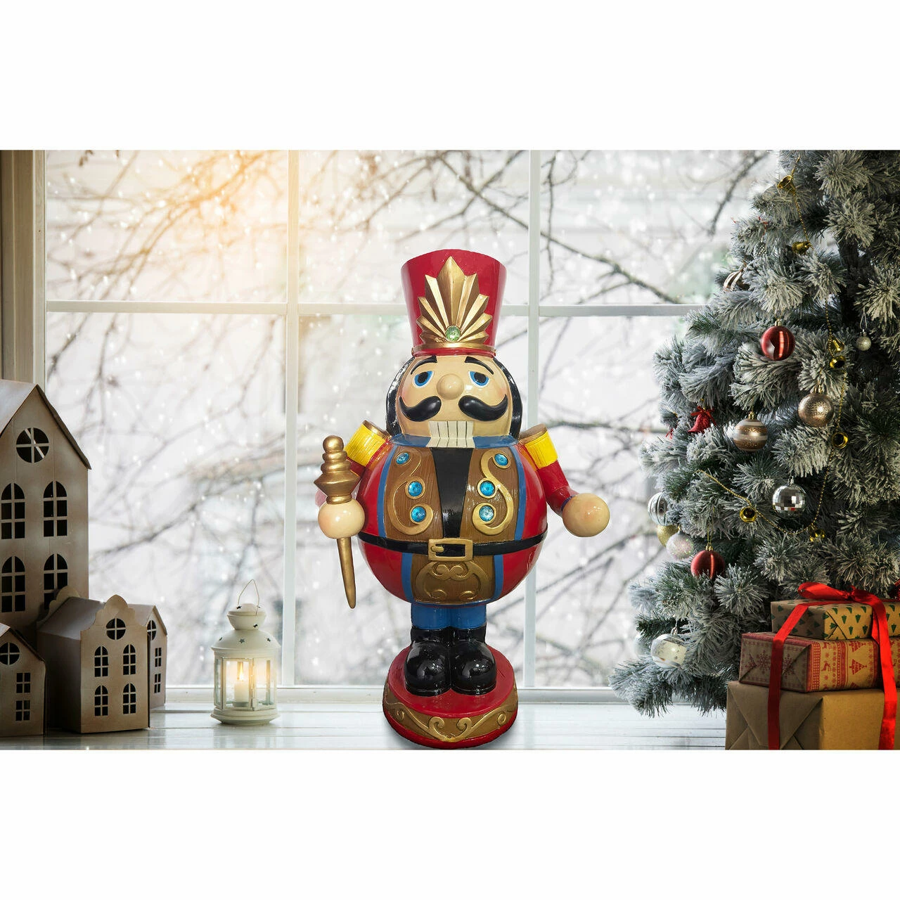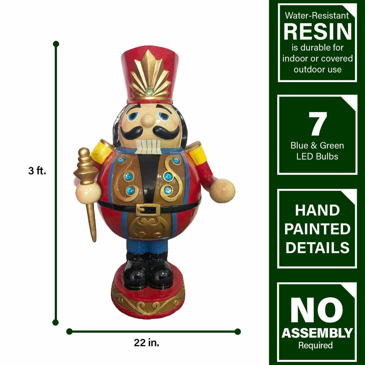 - Hand-painted 3-ft. roly-poly nutcracker greeter with gold detailing, plus 1 green and 6 blue LED lights