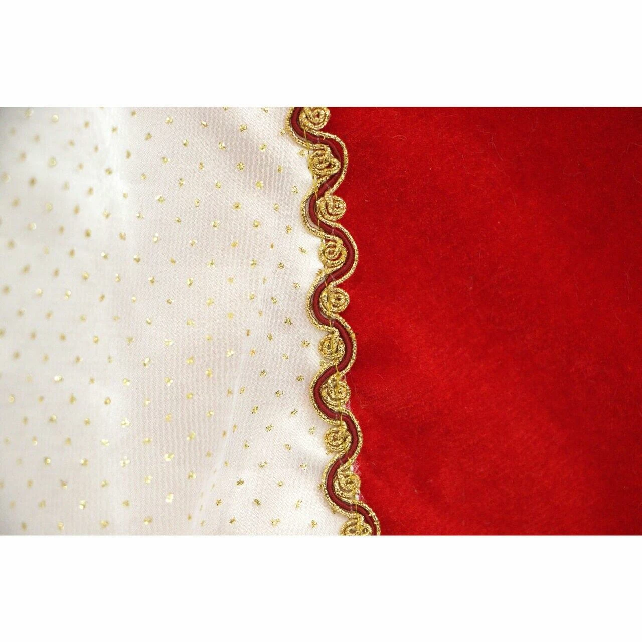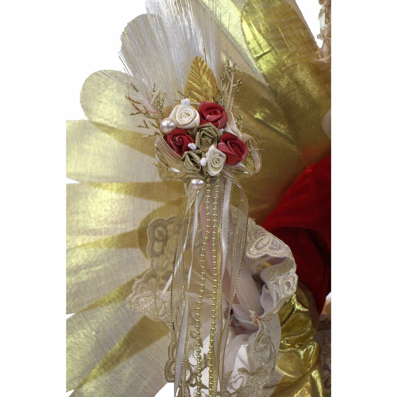 - Regally dressed in a red and white satin dress trimmed in gold ribbon to compliment her golden wings