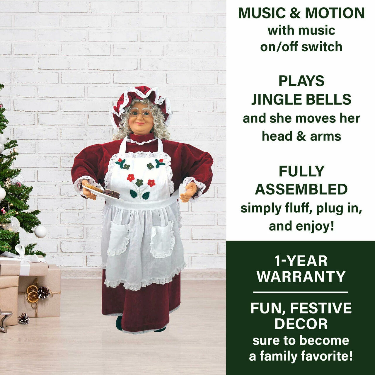 - 3-ft. Music and Motion Baking Mrs. Claus holds a plate full of Christmas cookies