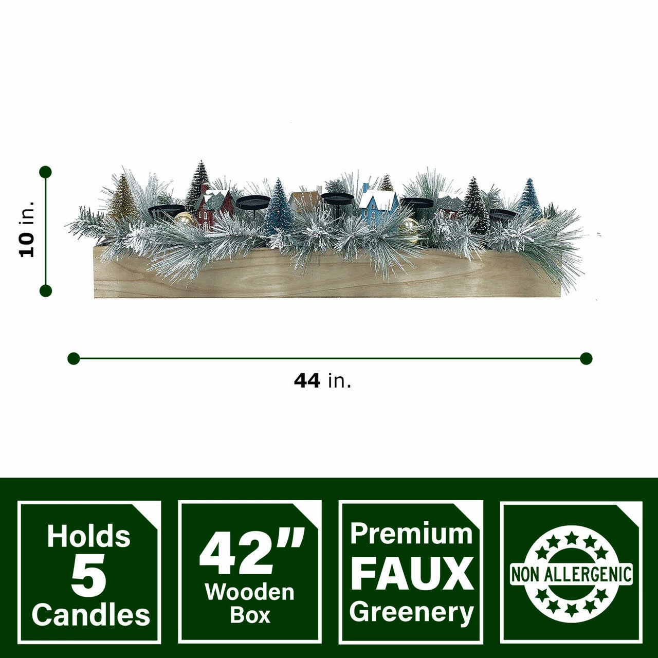 Spruce up your holiday decor with this five-candle holder centerpiece from Fraser Hill Farm. A rustic wooden box provides the perfect base for the beautiful arrangement, featuring artificial frosted pine branches, houses and bottlebrush trees. Five platforms are raised above the wintery display so you can add your favorite shape and scent of candles and change them out as you please. The centerpiece is decked out with realistic-yet-artificial pine branches, and topped off with bottlebrush trees and decorative houses. With this candle holder at the center of your festive gatherings, you’ll have seasons upon seasons of holiday cheer.
