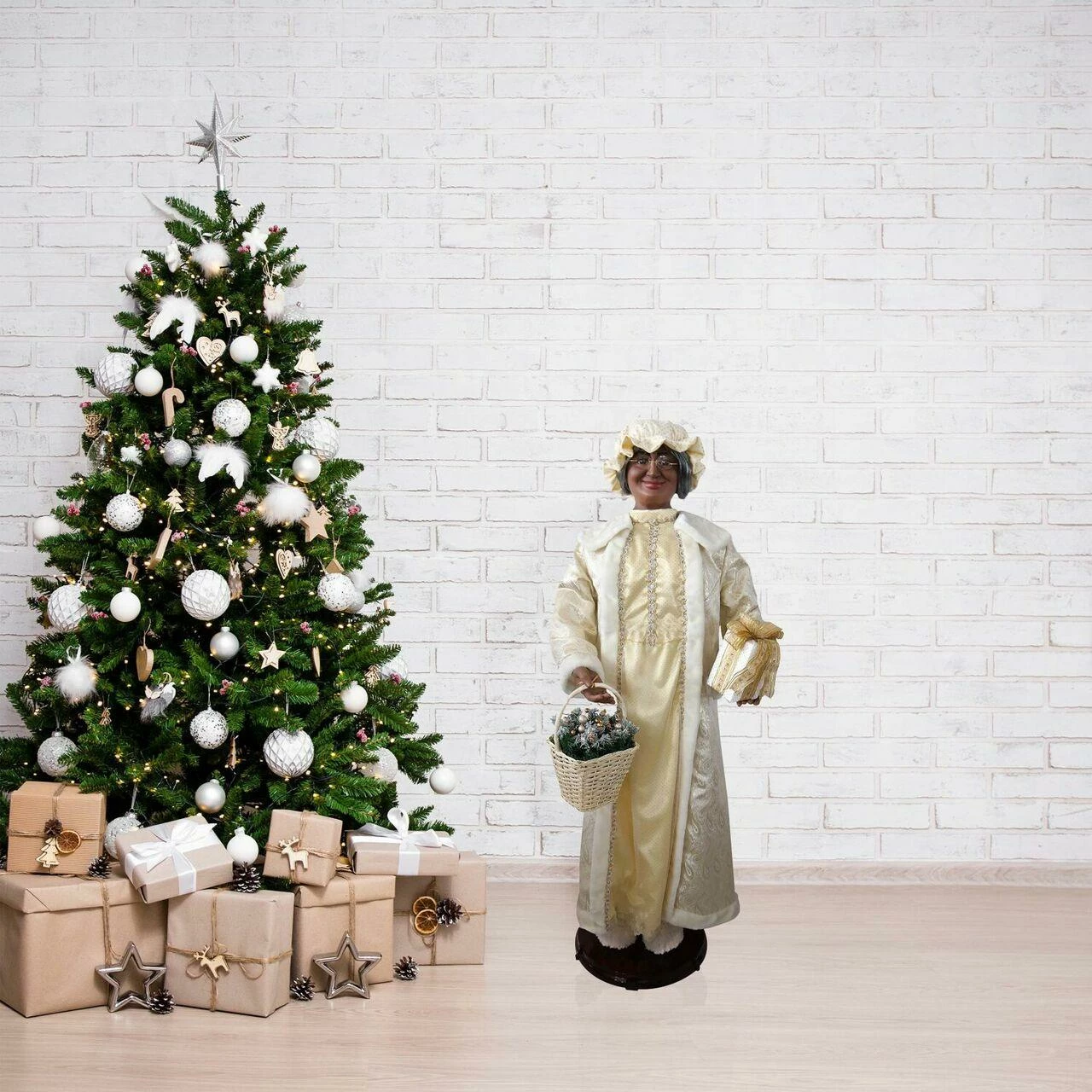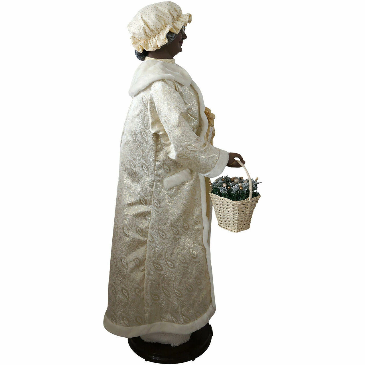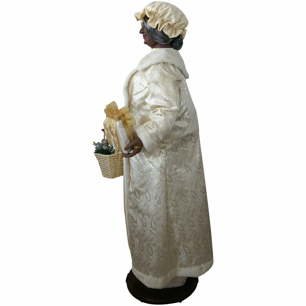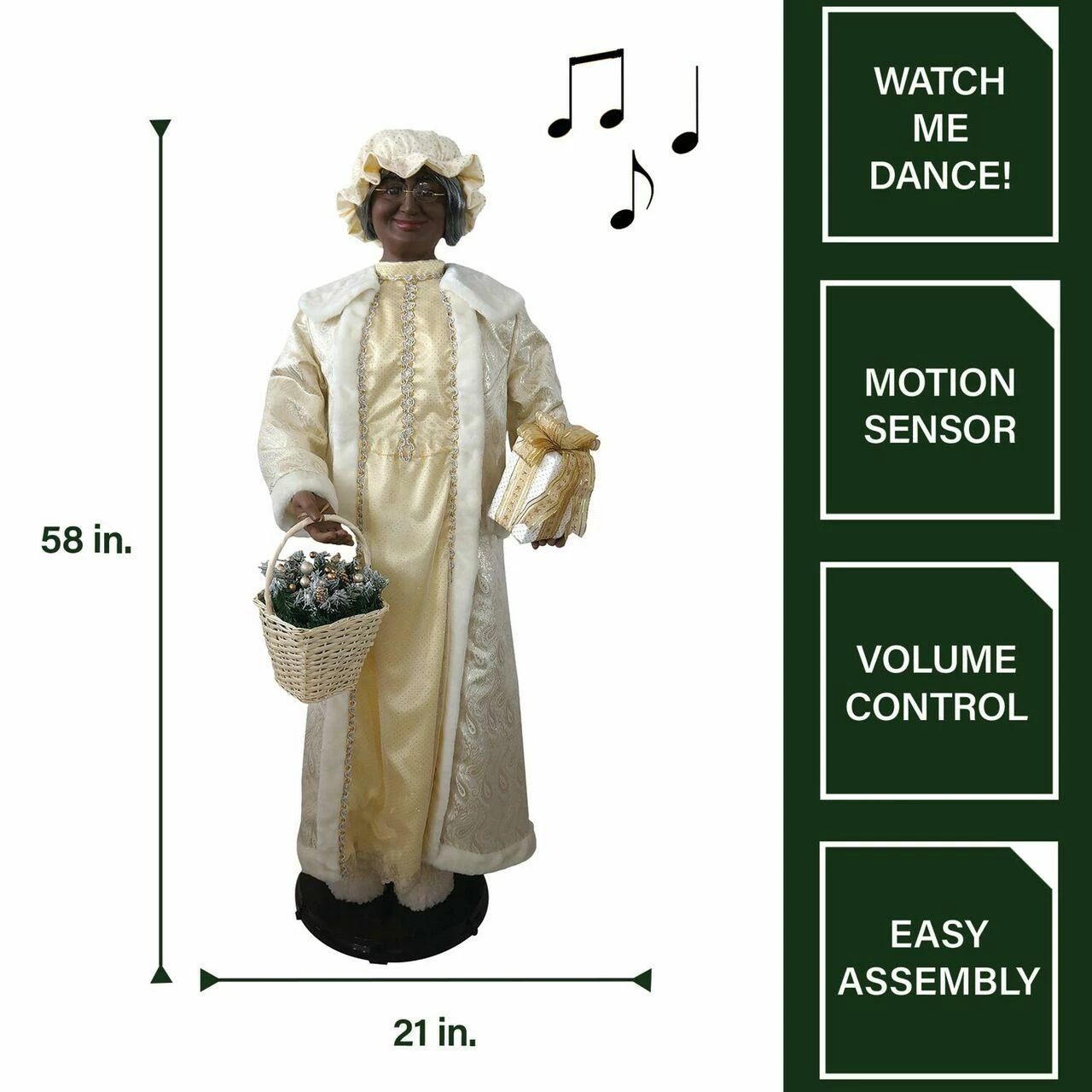 - 58-in. motion-activated African American dancing Mrs. Claus holds a wrapped gift and holiday basket