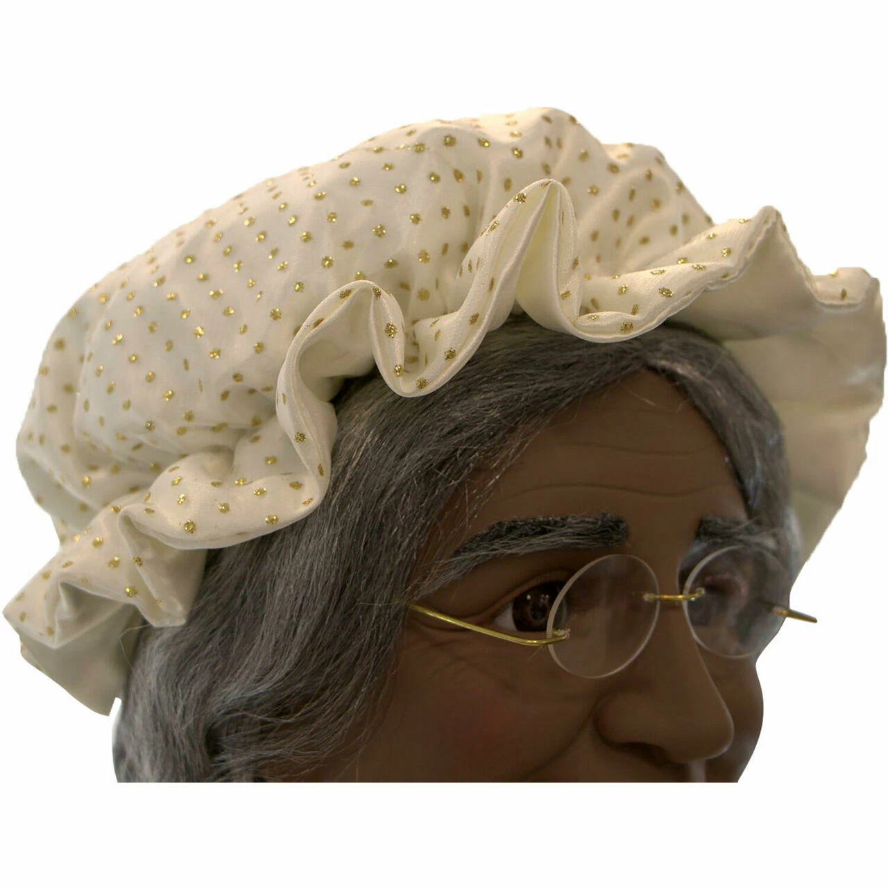 - Warm smile and friendly face with open spectacles, gray hair, and satin mob cap
