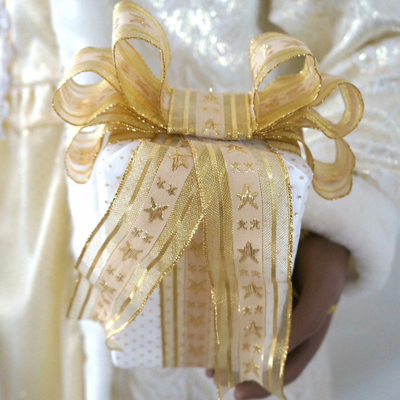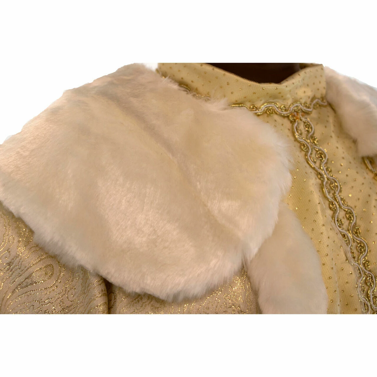 - Elegantly dressed in a gold-on-white paisley coat with furry white trim over a golden dress and white fleece boots