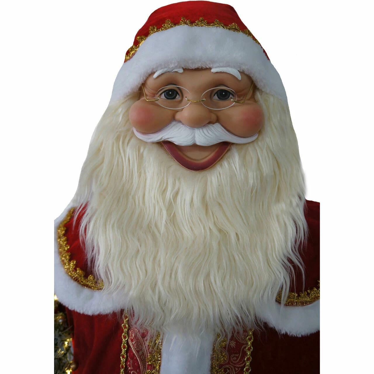 - Stylishly dressed in a bright red velvet suit with lavish red and gold brocade and fluffy white trim