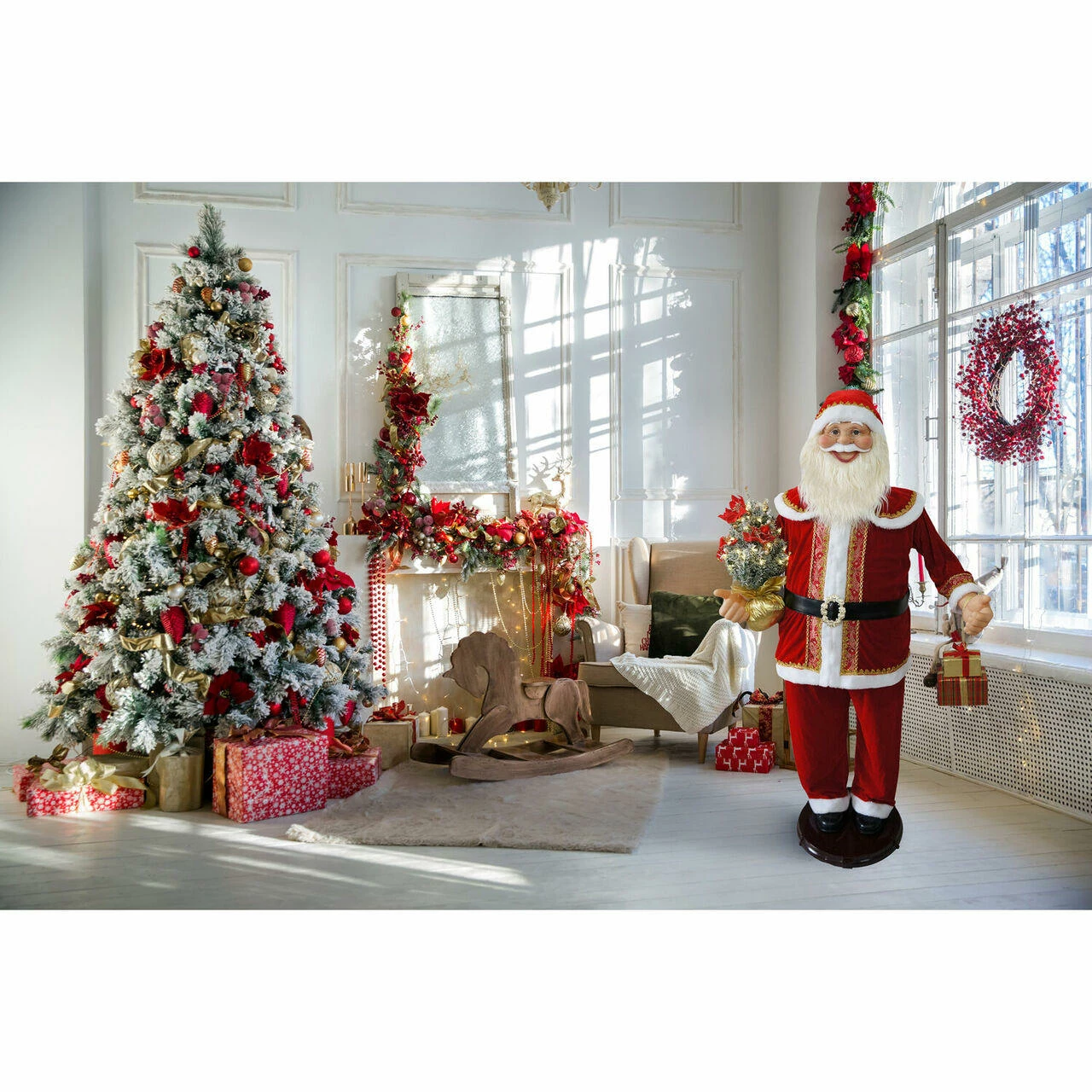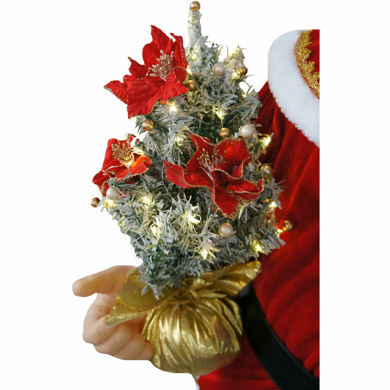 - Matching cap, black belt with golden buckle, and black boots complete Santa’s outfit