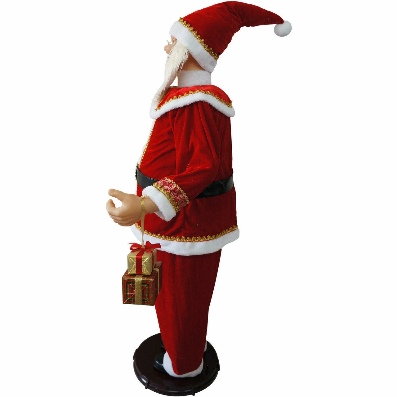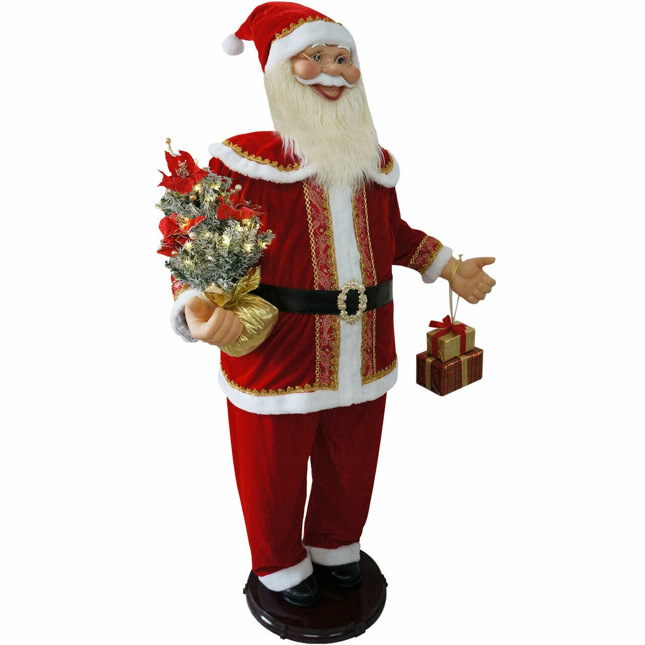 - 58-in. motion-activated dancing Santa Claus carries wrapped gifts and a lighted Christmas tree