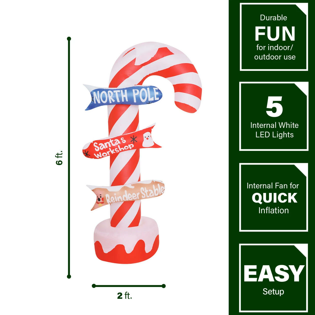 - Fraser Hill Farm 6-Ft. Pre-Lit Inflatable Candy Cane Direction Sign – airblown inflatable illuminates day and night with 5 internal LED white lights