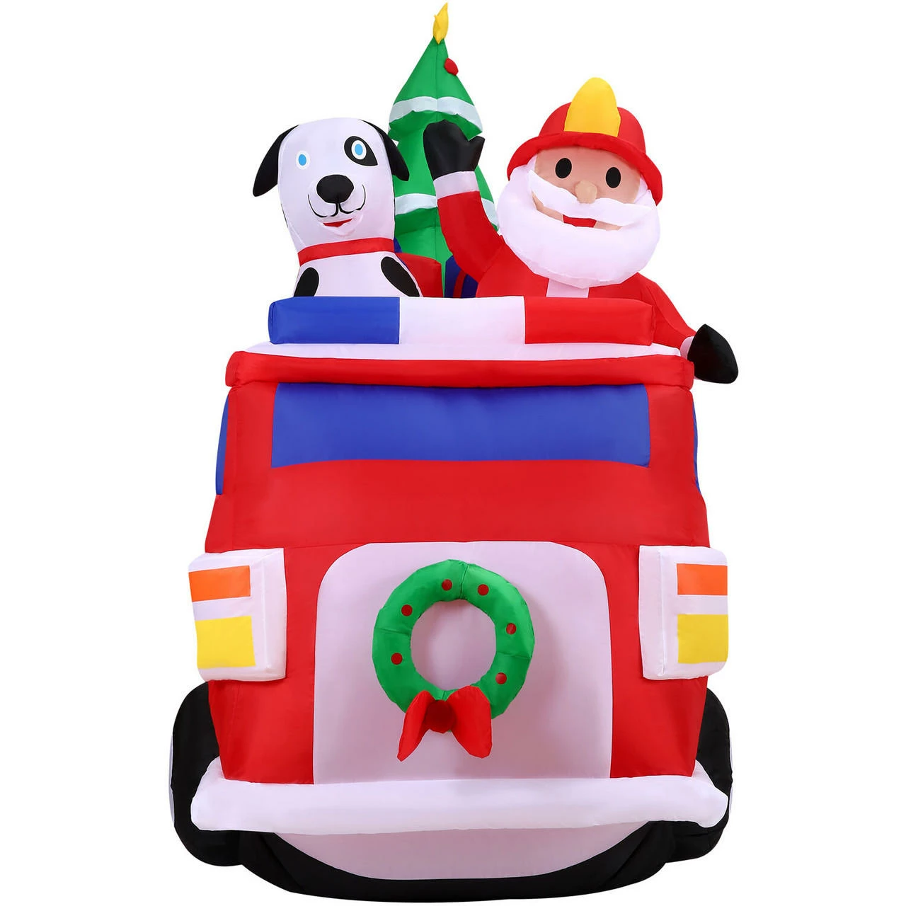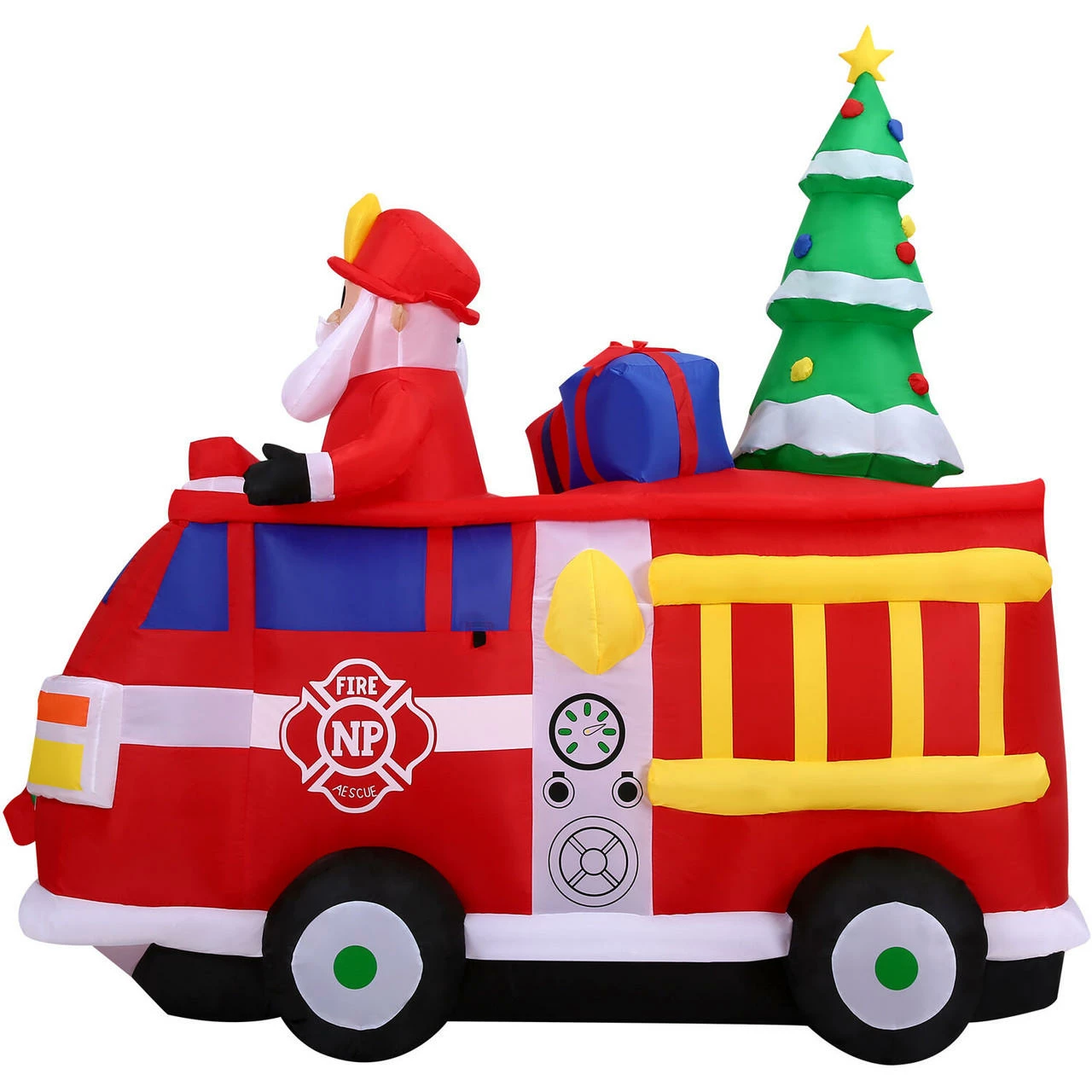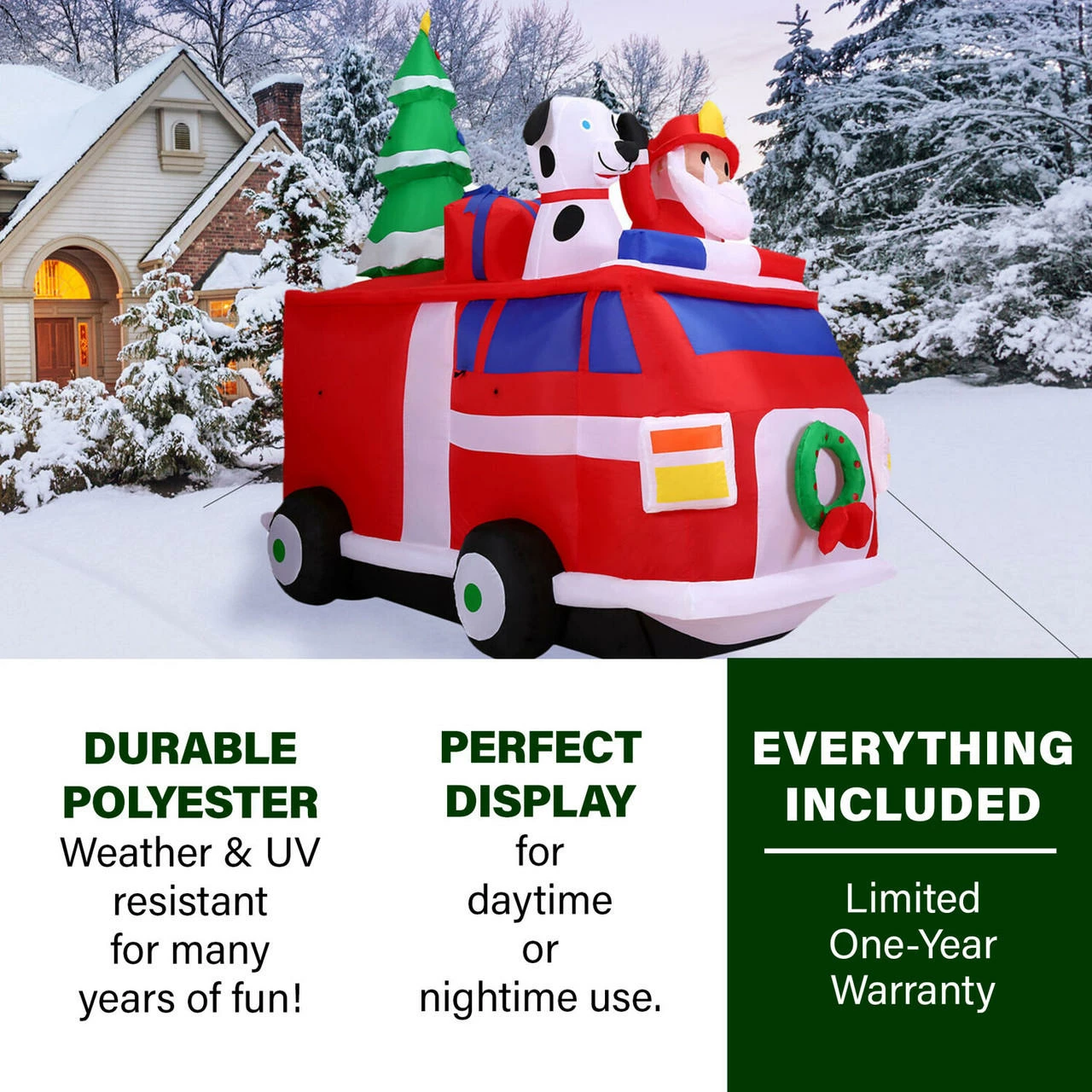 - 7-ft. Pre-Lit Inflatable Santa in Fire Truck illuminates day and night with 5 internal white LED lights