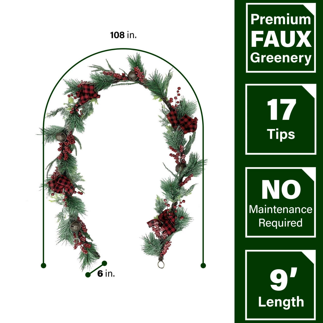Spruce up your holiday decor with a 9-foot artificial garland from Fraser Hill Farm. Whether you deck the halls indoors or outdoors, invest in quality decor that will last year after year. This garland features a mix of realistic pine greenery, red berries, plaid bows and rustic sleigh bells. The arrangement creates a complete look while evoking subtle feelings of Christmas. This garland is coveted for its delightful arrangement of realistic branches, farmhouse charm, and festive accents to complete the look. Wrap this garland around a railing, drape it over a mantel or anywhere else you see fit and spread holiday cheer that will last from one season to the next.
