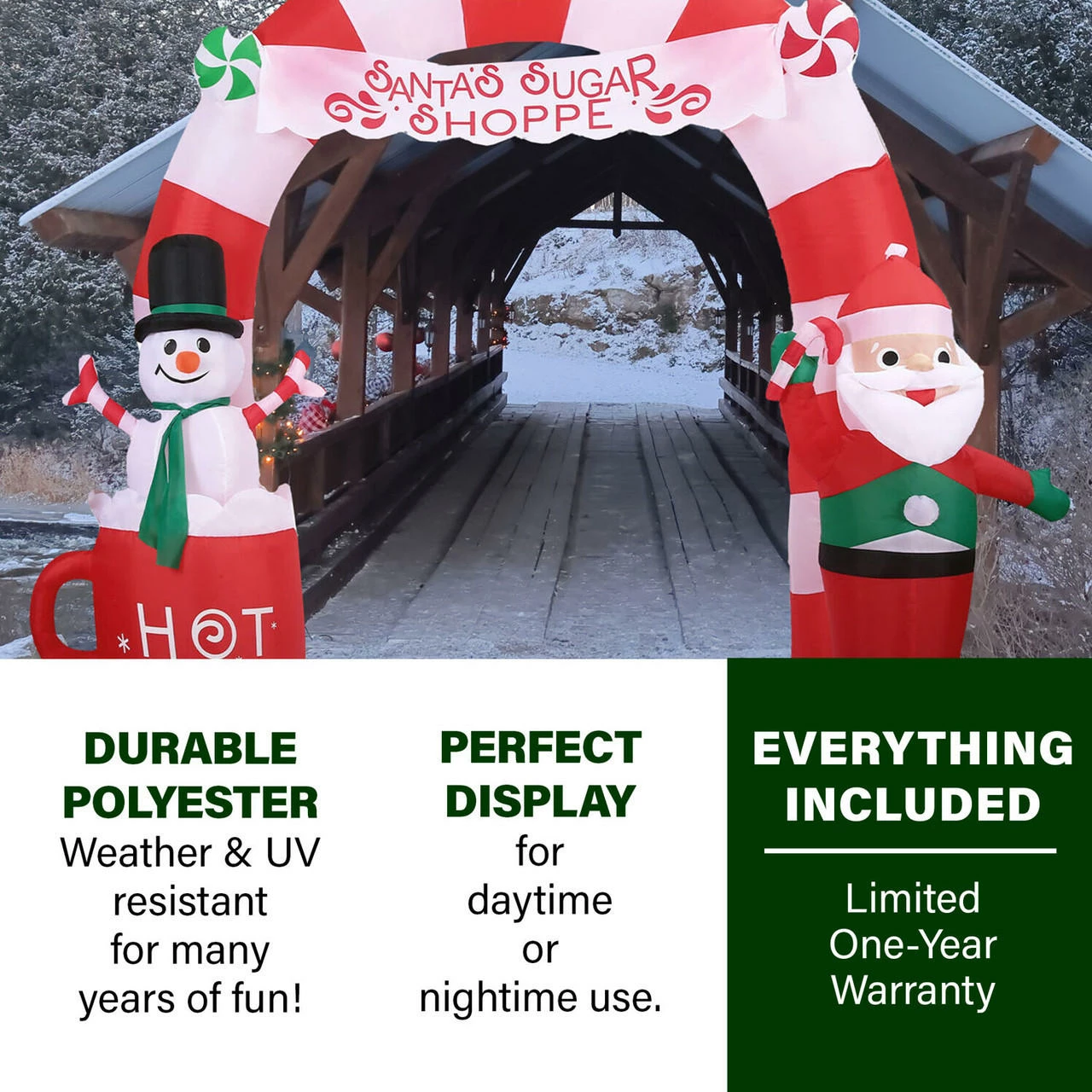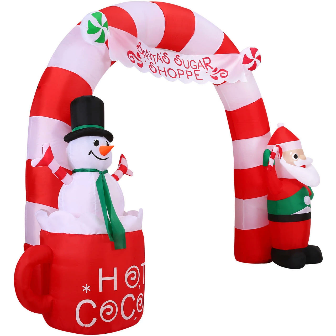 - 9-ft. wide Pre-Lit Inflatable Candy Cane Arch illuminates day and night with 5 internal white LED lights