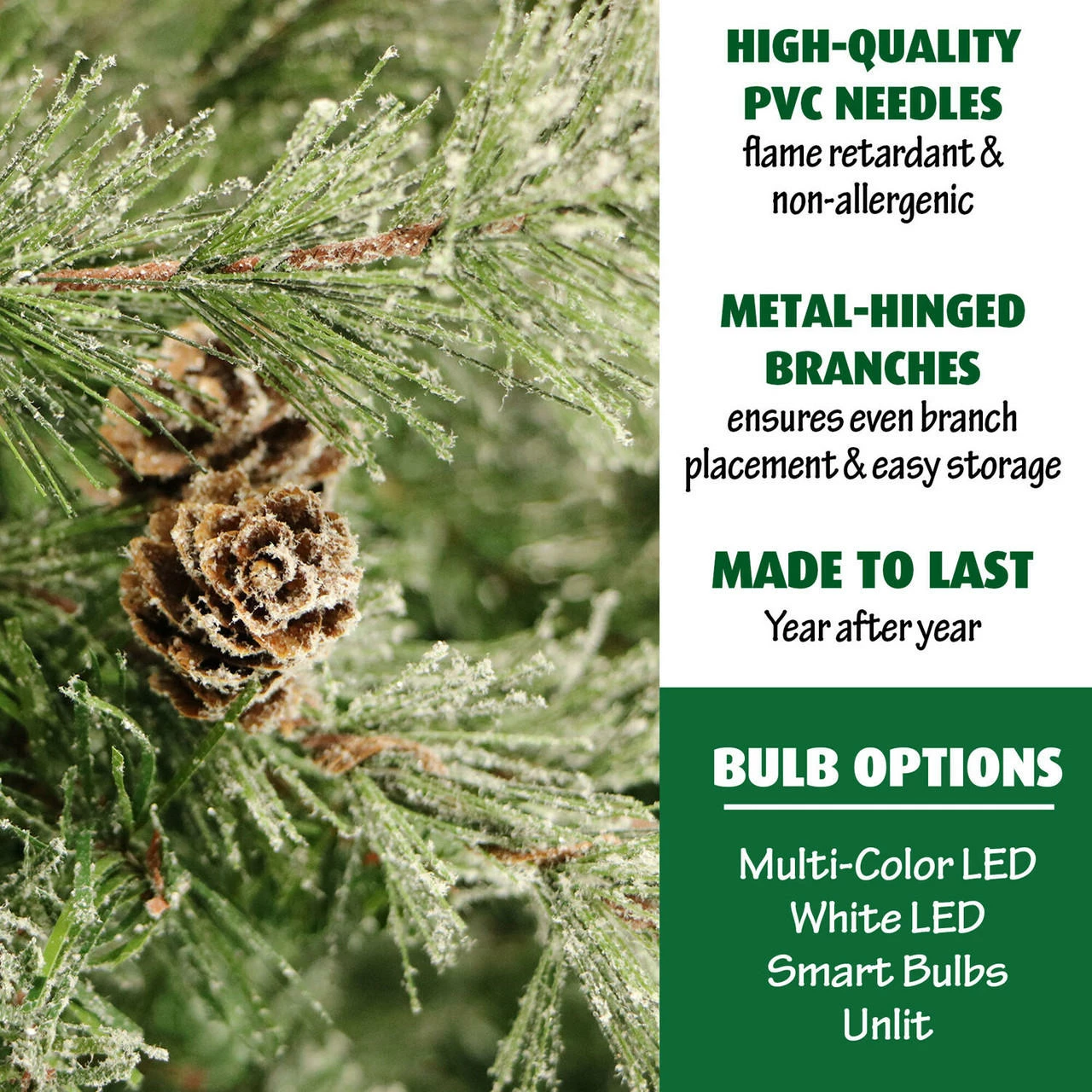 - Slim silhouette with lifelike foliage and pine cones
