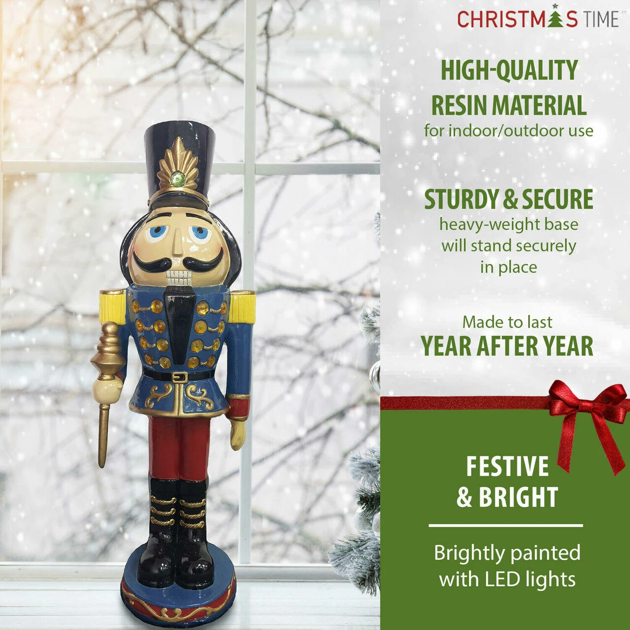 Deck your halls this holiday season with oversized resin decor from Christmas Time. Perfect for either indoor or covered outdoor use, our collection of resin statues will help you create a festive display that’s sure to impress friends, family, and carolers alike. Each intricately detailed item is crafted from weather-resistant resin then brightly hand-painted. Our impressive nutcracker greeter stands 36 inches tall and is prelit with 17 LED lights. Dressed in his blue coat, red pants, black boots, and tall black hat, he will add a special glow to your porch, entryway, fireplace hearth, or near the tree. For decorations that celebrate the magic of Christmas, count on quality products from Christmas Time.