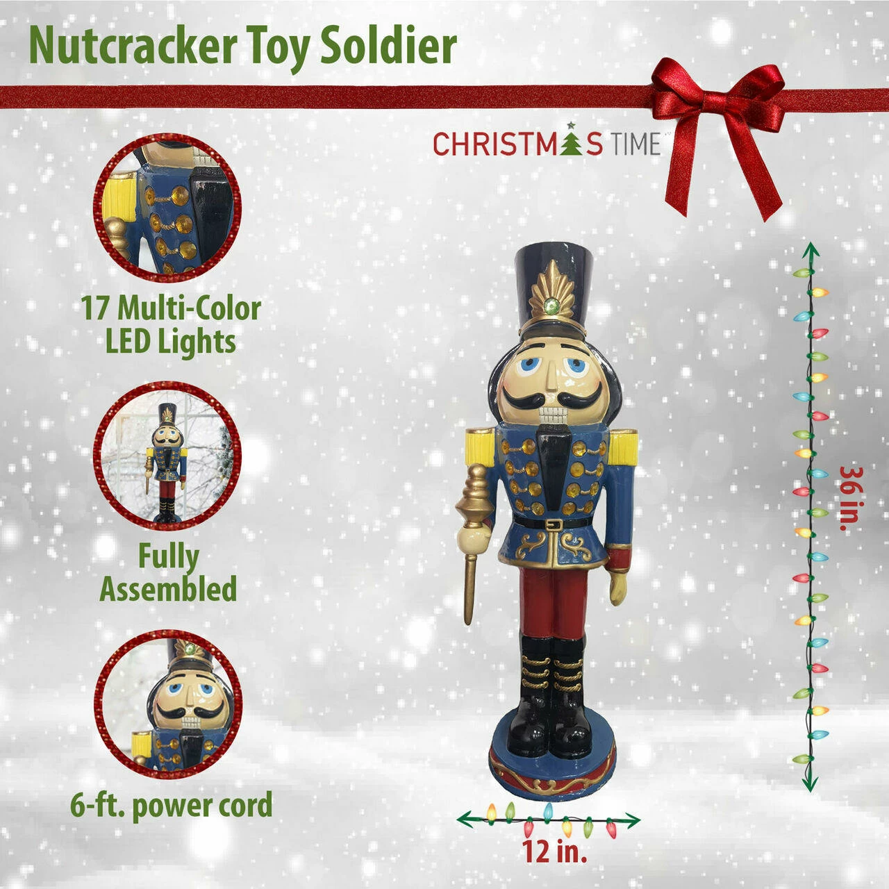 - Hand-painted 3-ft. nutcracker greeter with gold detailing, plus 1 green and 16 gold LED lights