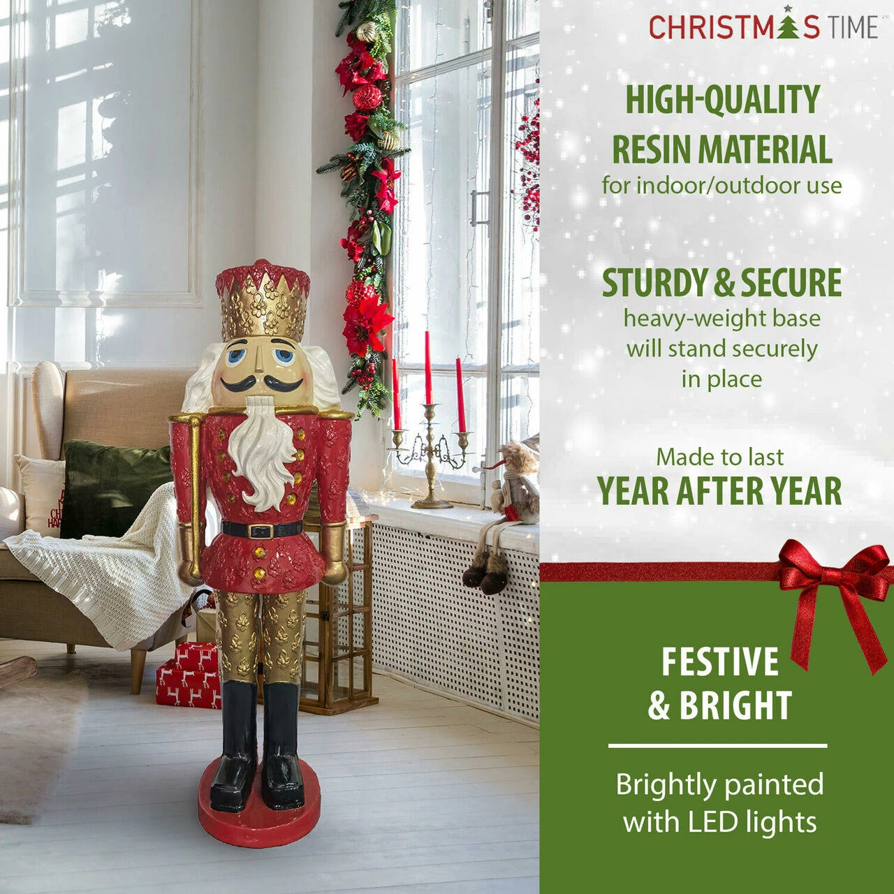 - Hand-painted 4-ft. nutcracker king with intricate detailing and 10 gold LED lights