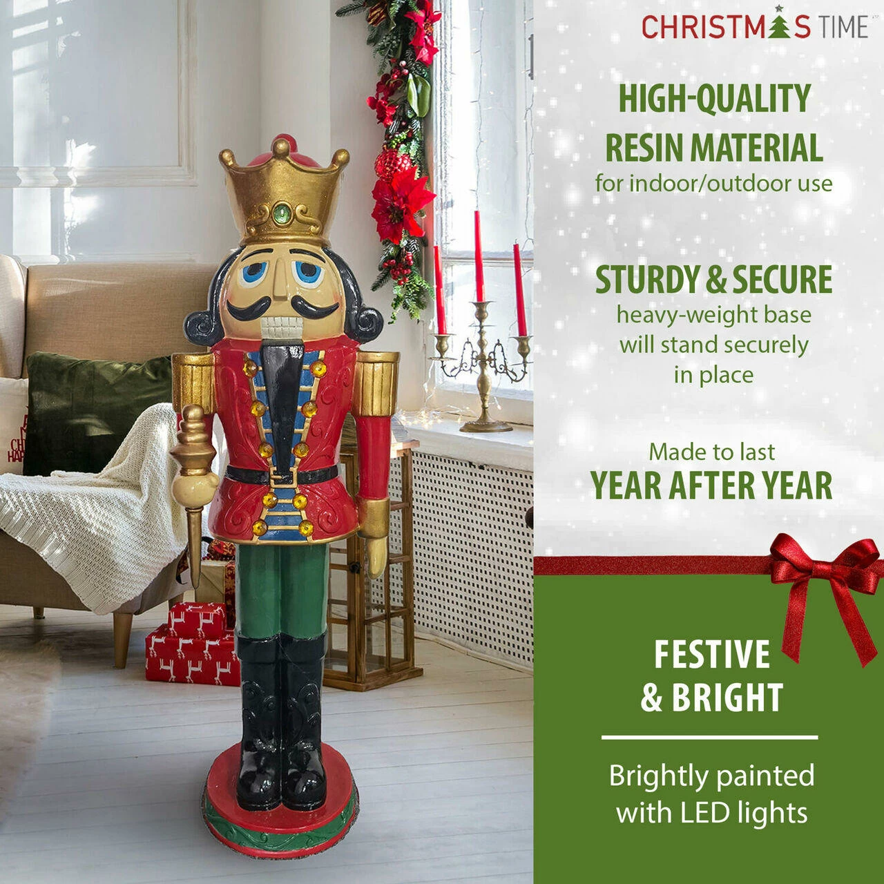 Deck your halls this holiday season with oversized resin decor from Christmas Time. Perfect for either indoor or covered outdoor use, our collection of resin statues will help you create a festive display that’s sure to impress friends, family, and carolers alike. Each intricately detailed item is crafted from weather-resistant resin then brightly hand-painted. Our impressive nutcracker king stands 48 inches tall and is prelit with 11 LED lights. Dressed in his red coat, green pants, black boots, and gold crown, he will add a special glow to your porch, entryway, fireplace hearth, or near the tree. For decorations that celebrate the magic of Christmas, count on quality products from Christmas Time.