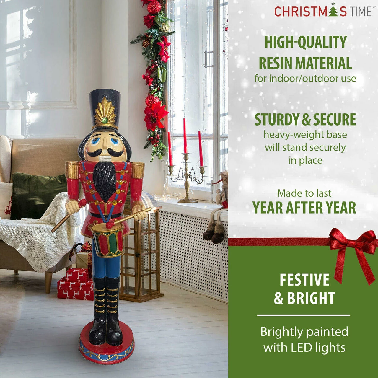 Deck your halls this holiday season with oversized resin decor from Christmas Time. Perfect for either indoor or covered outdoor use, our collection of resin statues will help you create a festive display that’s sure to impress friends, family, and carolers alike. Each intricately detailed item is crafted from weather-resistant resin then brightly hand-painted. Our impressive nutcracker drummer stands 48 inches tall and is prelit with 9 LED lights. Dressed in his red coat, blue pants, black boots, and tall black hat, he will add a special glow to your porch, entryway, fireplace hearth, or near the tree. For decorations that celebrate the magic of Christmas, count on quality products from Christmas Time.