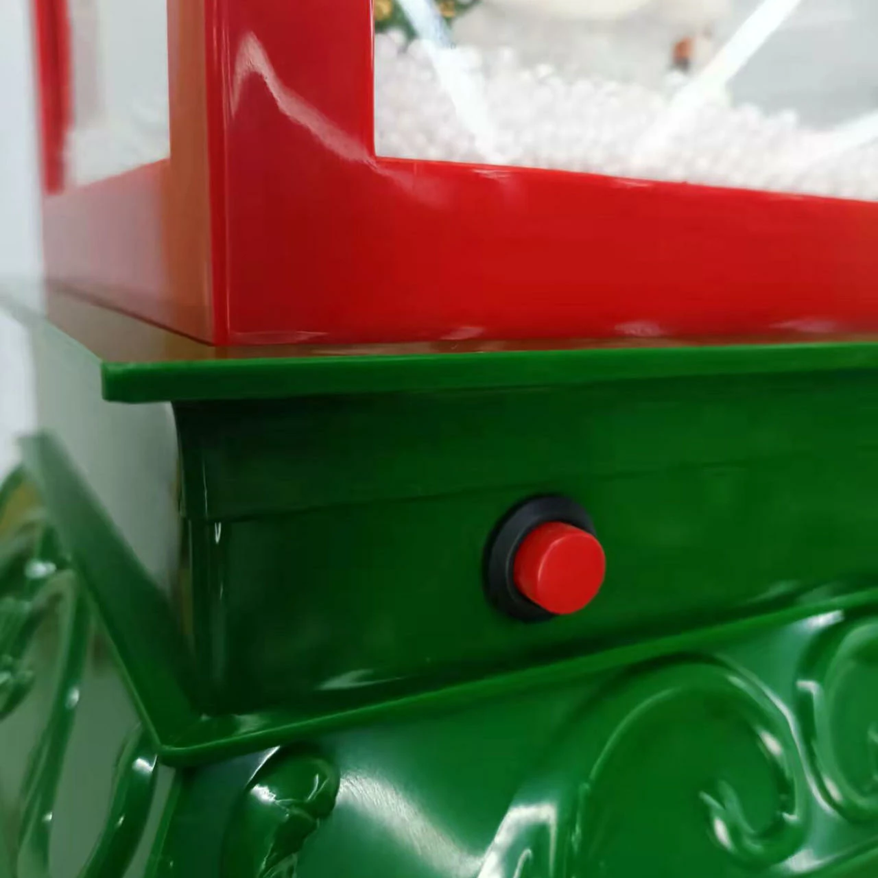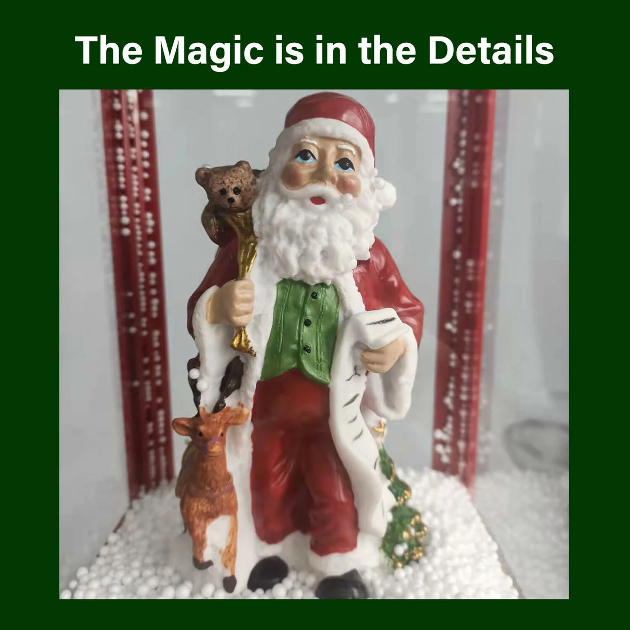 - Faux-snow cascades over Santa Claus, creating a magical winter wonderland