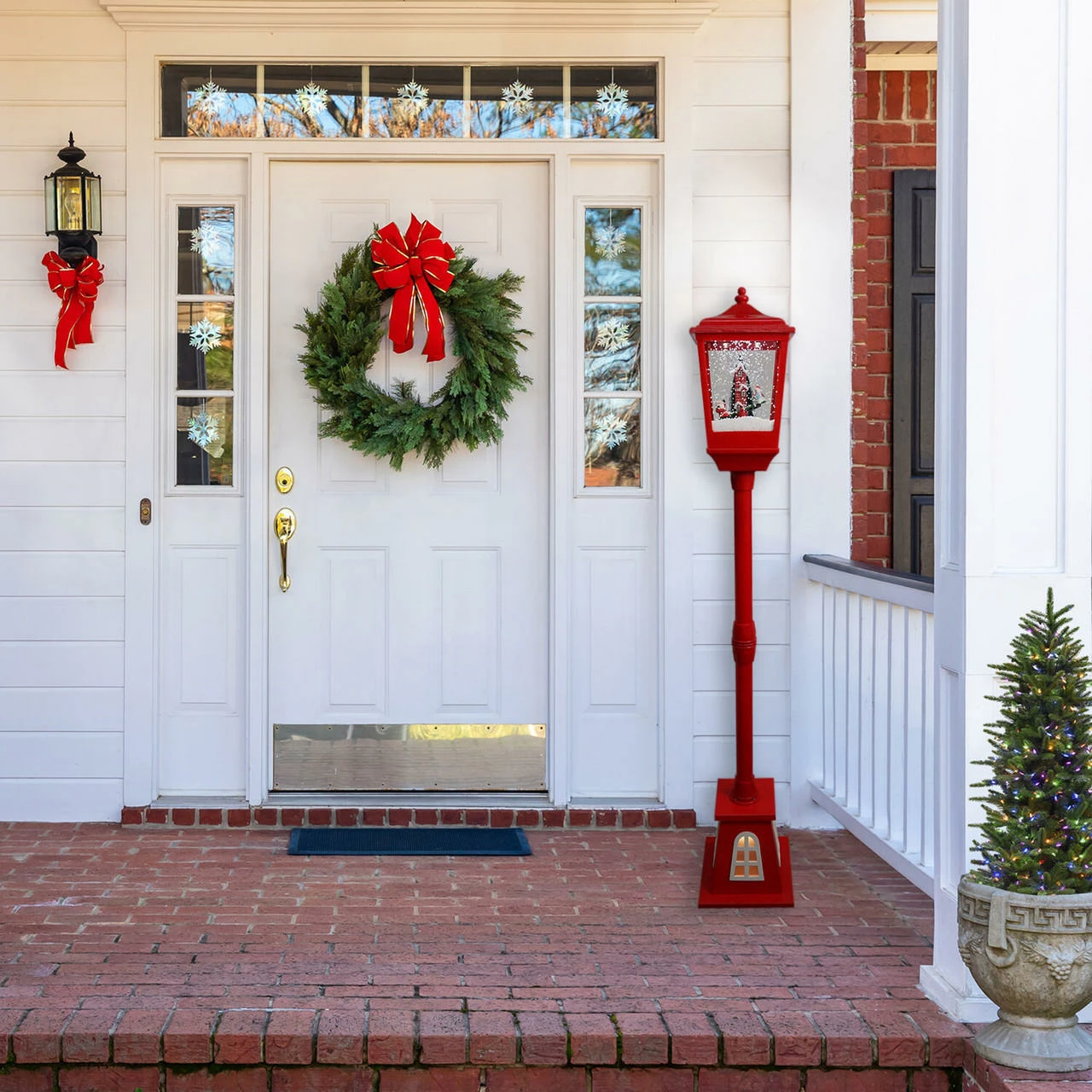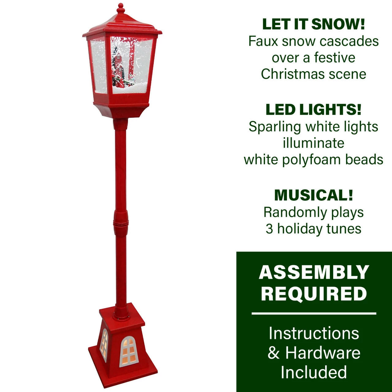 Capture the magic of falling snow with this 53-inch musical street lamp from the Let It Snow series by Fraser Hill Farm, where all products produce flurries of faux snow that fall over various holiday scenes. Sparkling white LED lights illuminate the polyfoam beads cascading over Santa and a snowman on a seesaw. Warm white light radiates from the windows on the base, creating a unique holiday decoration. Three popular Christmas tunes (Jingle Bells, We Wish You a Merry Christmas, and Oh! Christmas Tree) play randomly while the artificial snow flutters inside the lantern. You can enjoy the lights and snowfall with or without music. This unique snowy lamp post will help create a magical winter wonderland on your covered porch near the doorway or anywhere inside your beautiful home. Plug it in, and let it snow, let it snow, let it snow!