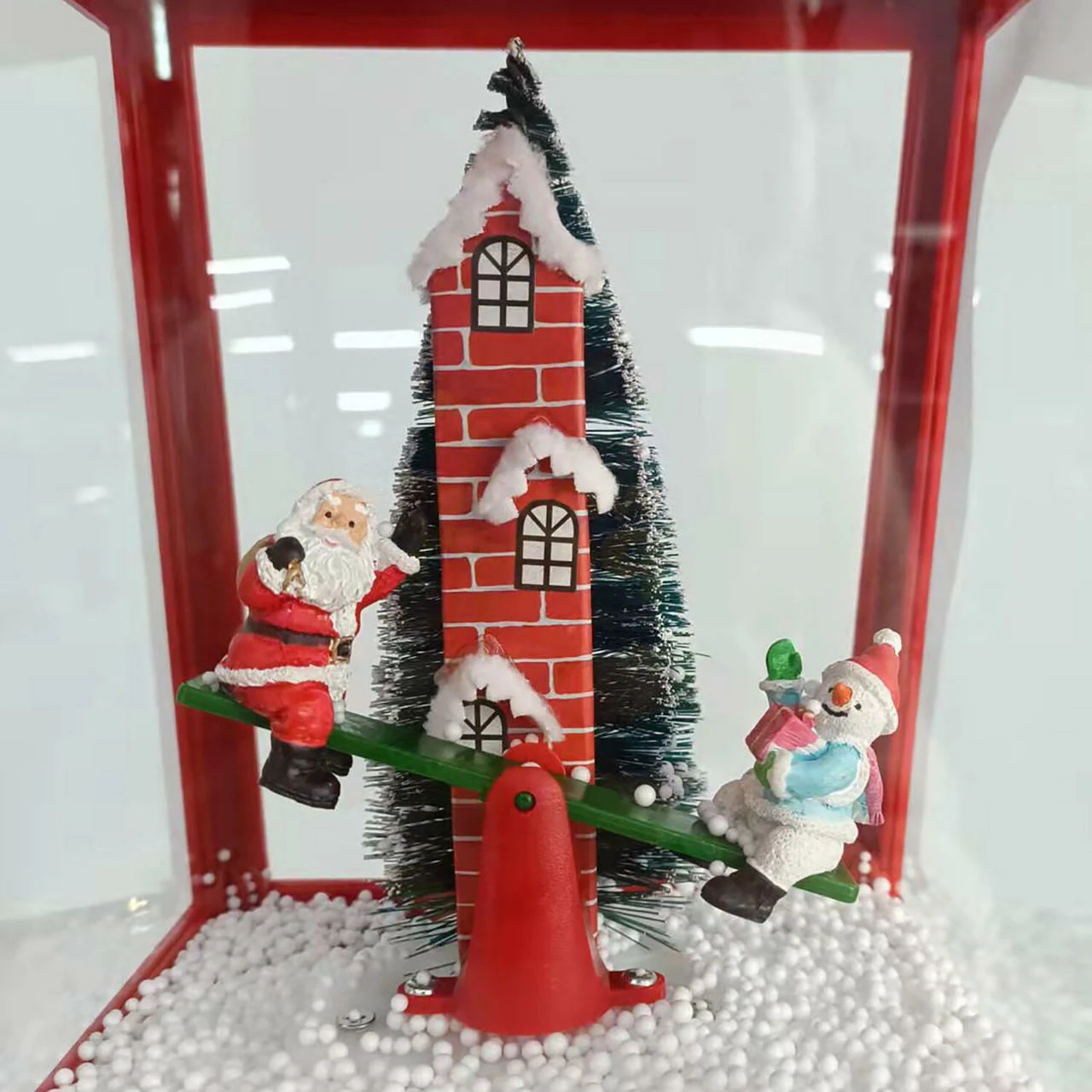 - Faux-snow cascades over Santa and a snowman on a seesaw, creating a magical winter wonderland