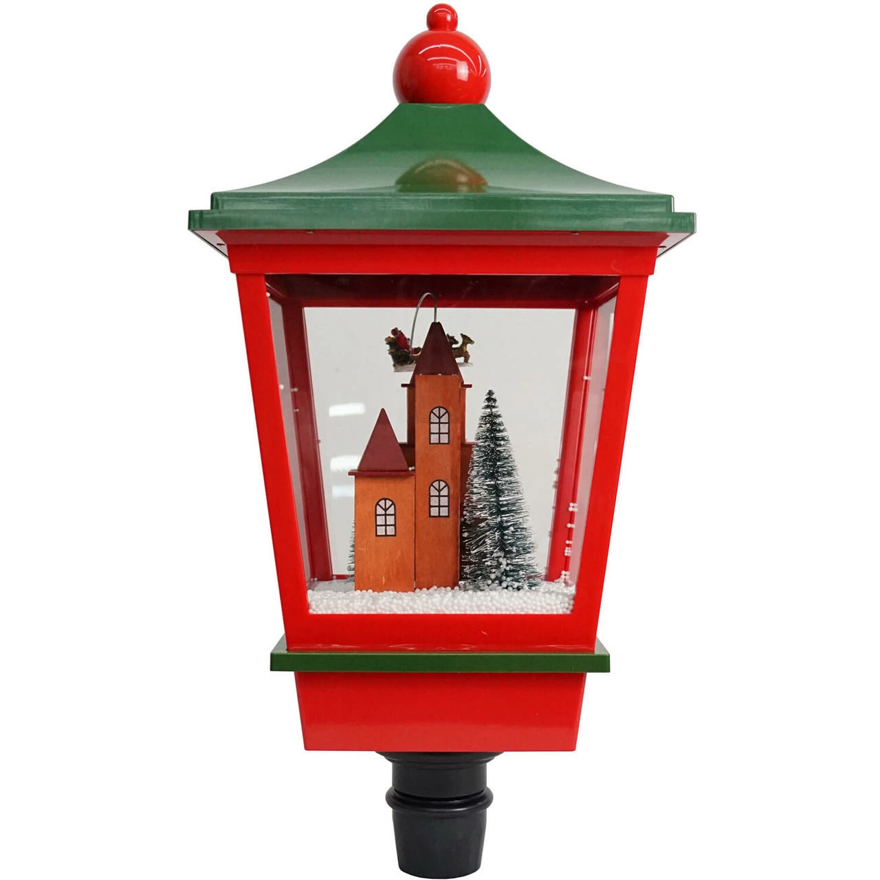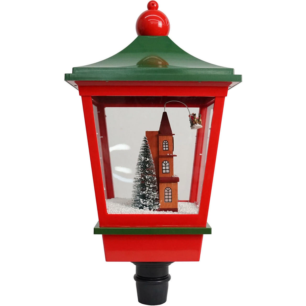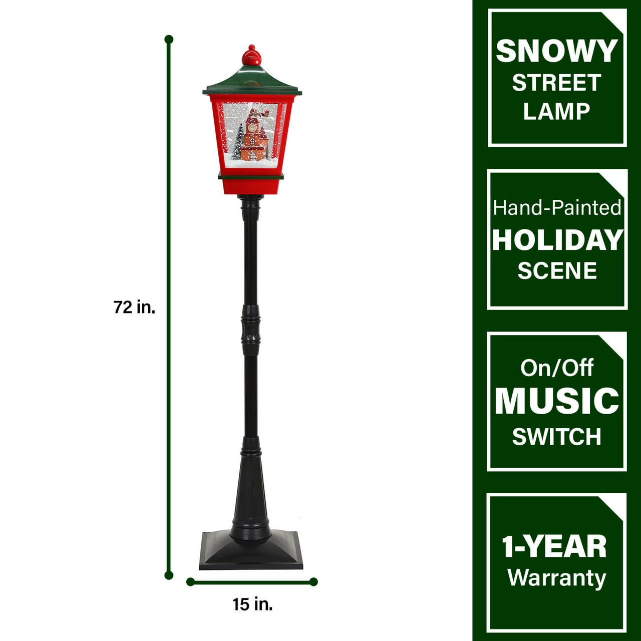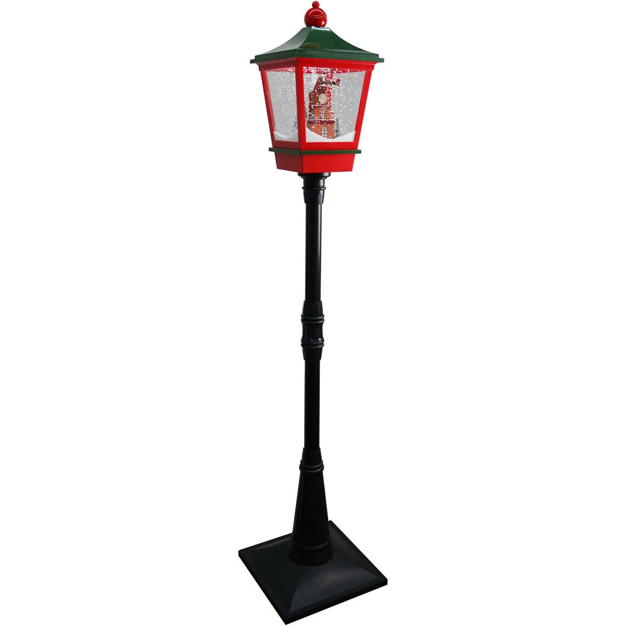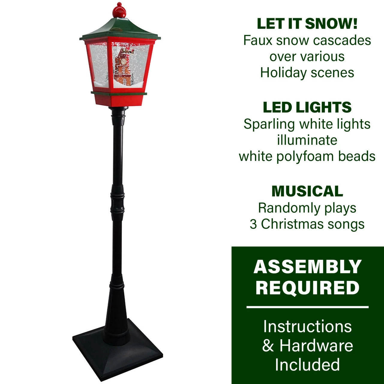 Capture the magic of falling snow with this 6-feet musical street lamp from the Let It Snow series by Fraser Hill Farm, where all products produce flurries of faux snow that fall over various holiday scenes. Sparkling white LED lights illuminate the polyfoam beads cascading over Santa flying in his sleigh. Three popular Christmas tunes (Jingle Bells, We Wish You a Merry Christmas, and Oh! Christmas Tree) play randomly while the artificial snow flutters inside the lantern. You can enjoy the lights and snowfall with or without music. This unique holiday lamp post will help create a magical winter wonderland on your covered porch near the doorway or anywhere inside your beautiful home. Plug it in, and let it snow, let it snow, let it snow!