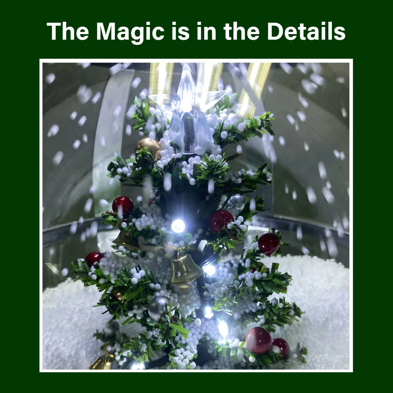 - Faux-snow cascades over a Christmas tree scene – no water needed