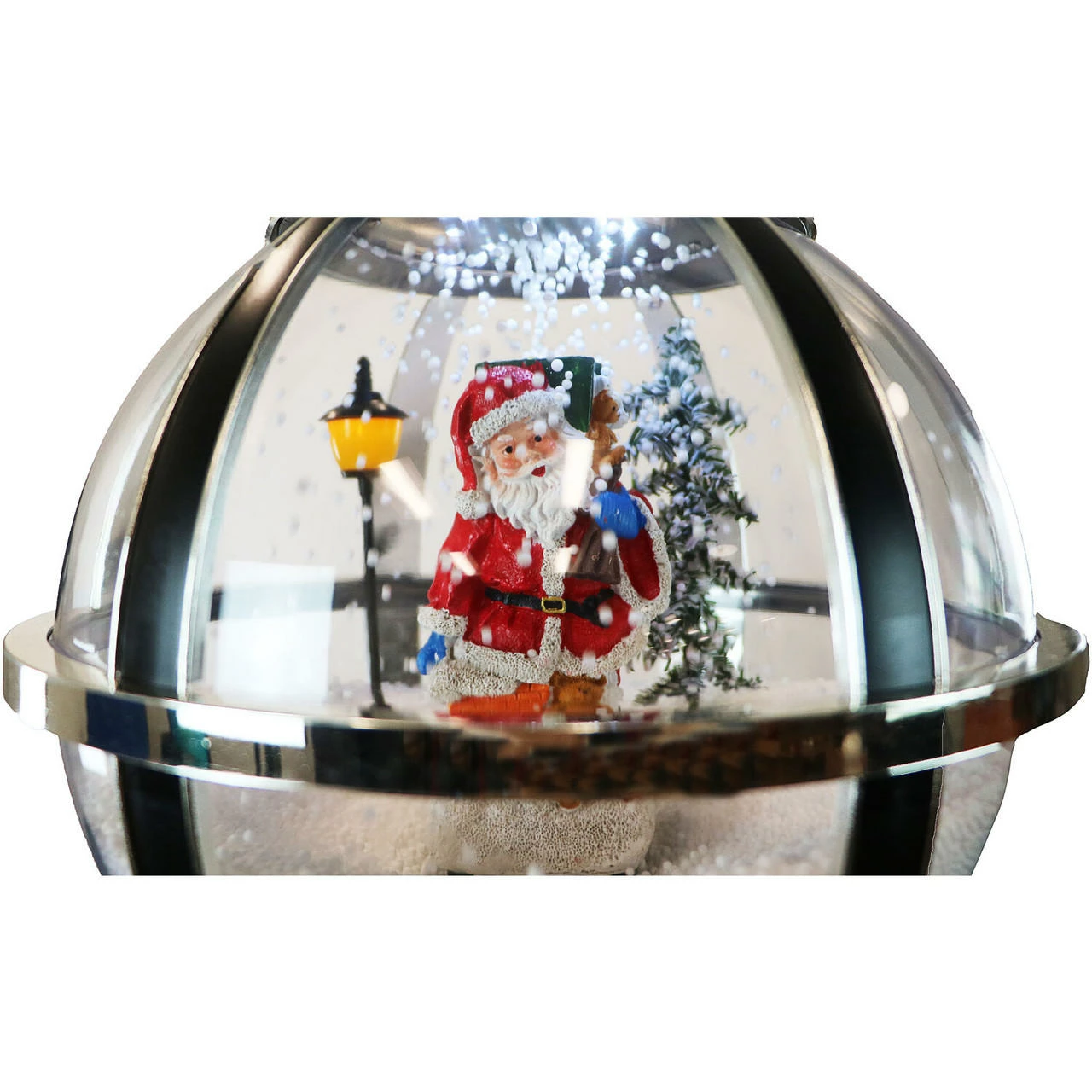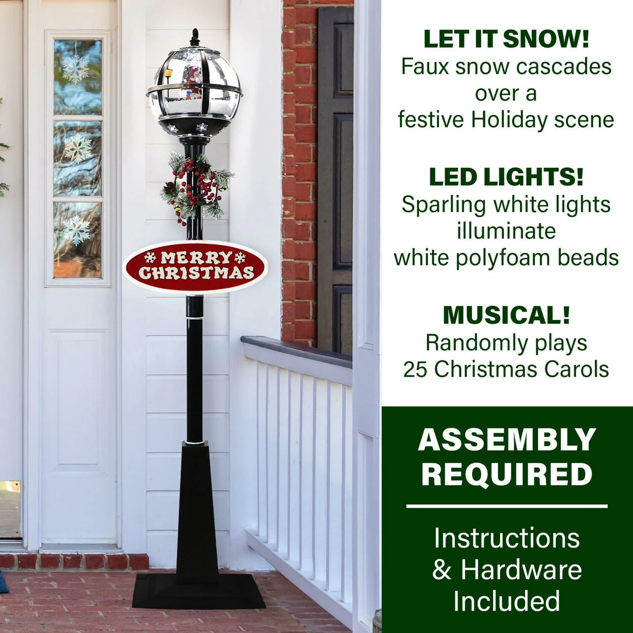 Greet your guests with this waterless snow globe lamp post from Fraser Hill Farm’s Let It Snow series, where all products produce flurries of faux-snow that fall over a variety of holiday scenes. Watch as brightly lit snow cascades over a traditional Santa scene while your favorite Christmas Carols play in the background. Sing along to 25 family favorites such as Jolly Old Saint Nicholas, The Twelve Days of Christmas, Joy to the World, and many more. The magic of the holidays is truly embodied in this decorative lamp post. With two festive signs displaying “Let it Snow” and “Merry Christmas”, a berry-covered wreath, and a classic red bow, this unique holiday street lamp will help create a magical winter wonderland on your porch, walkway, driveway, or anywhere else in your yard. Simply plug it in and let it snow, let it snow, let it snow!