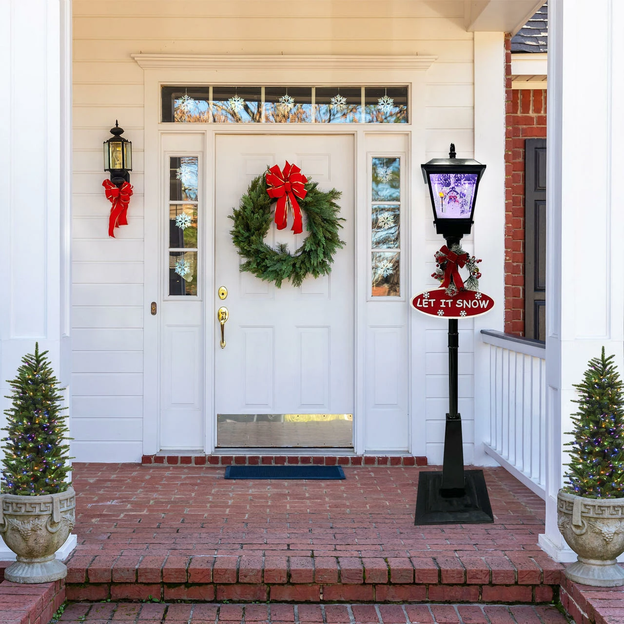 - Includes Let it Snow sign, Merry Christmas sign, berry-covered wreath, and classic red bow