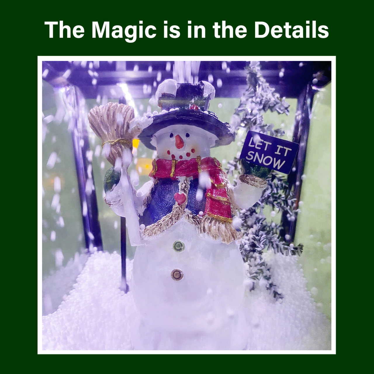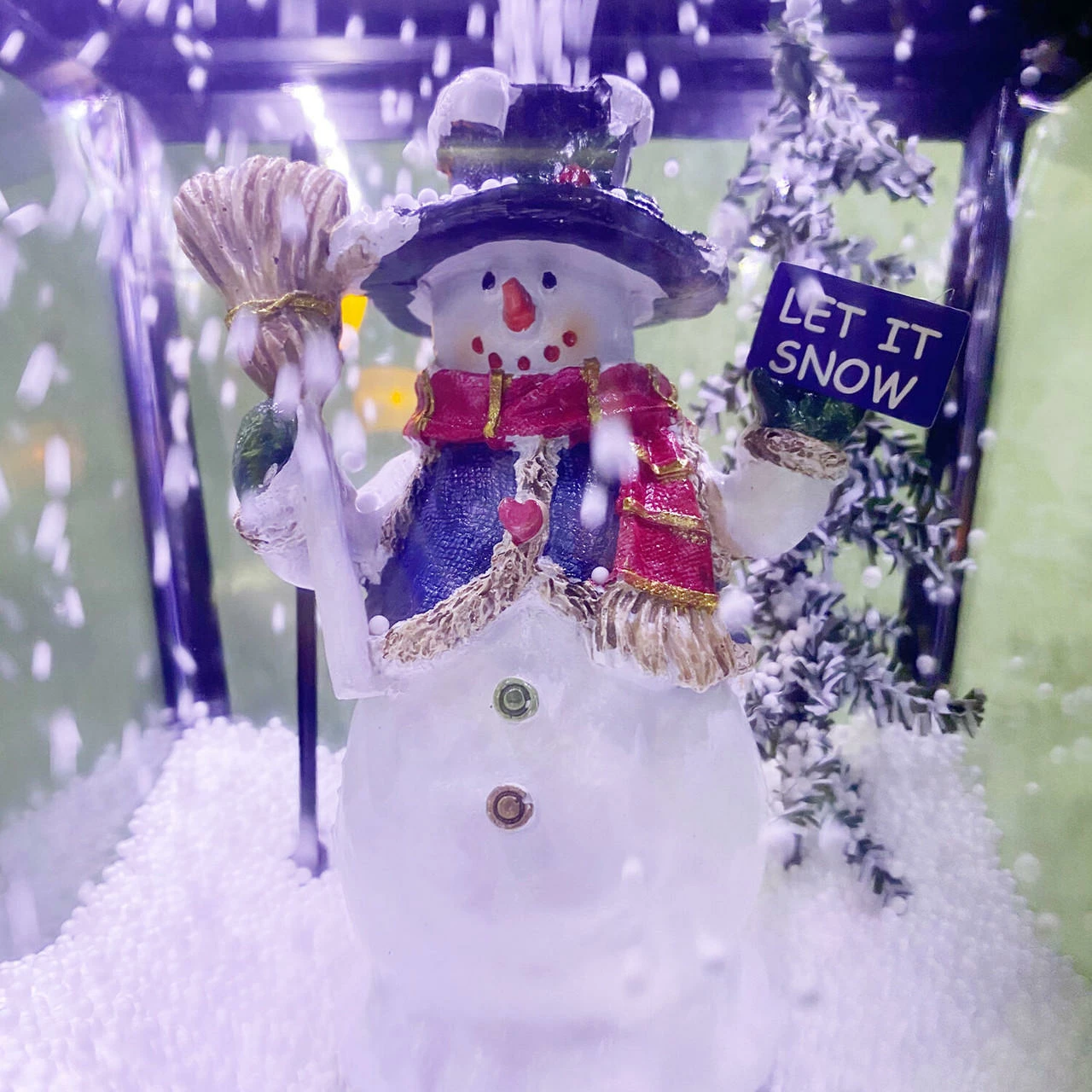 - Faux-snow cascades over a snowman scene – no water needed