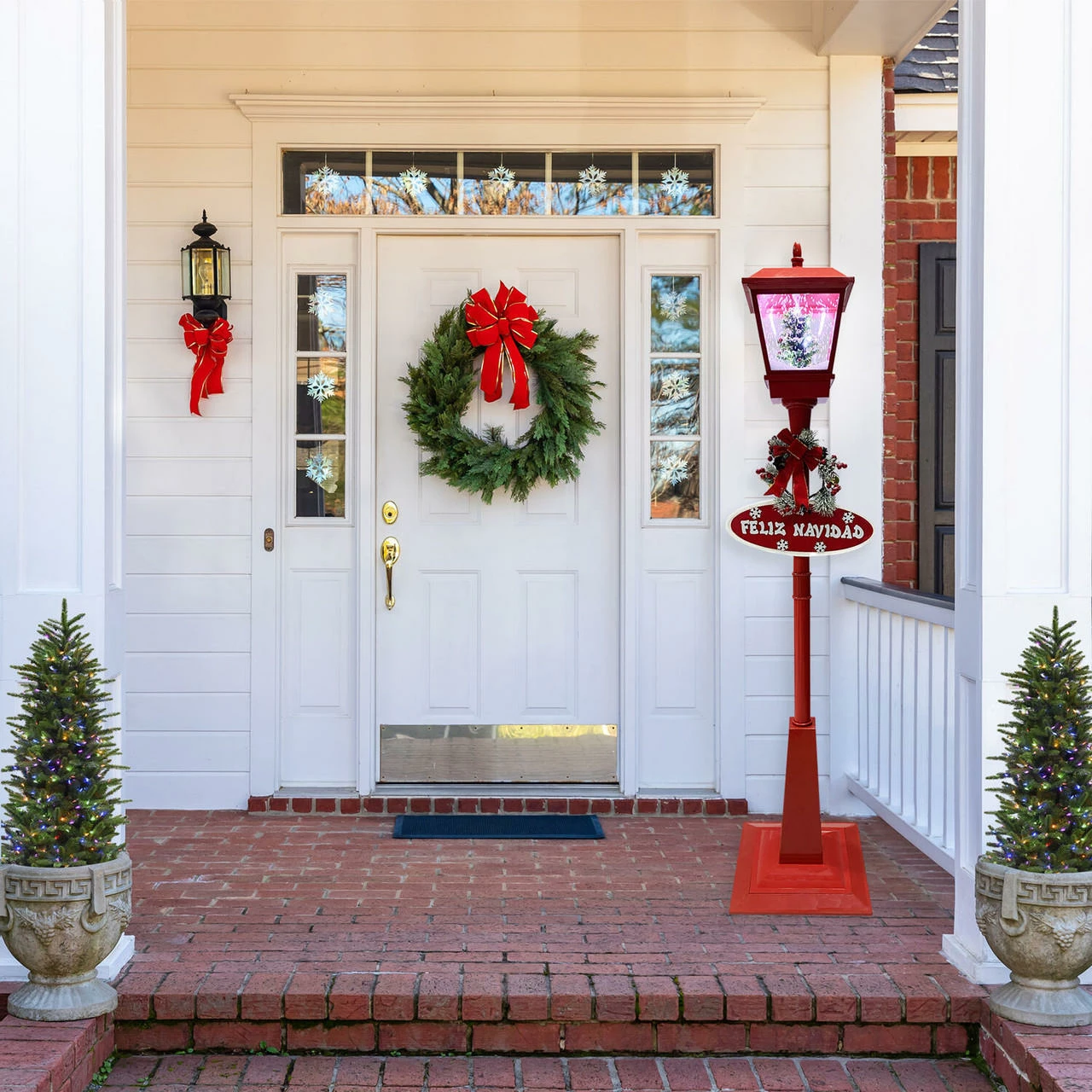 - Includes Feliz Navidad sign, Let it Snow sign, berry-covered wreath, and classic red bow