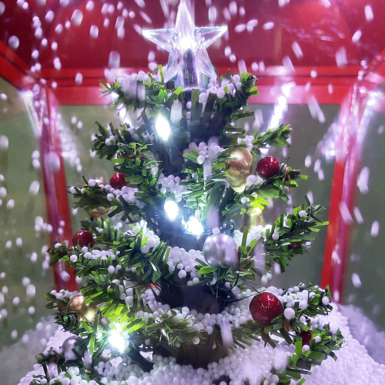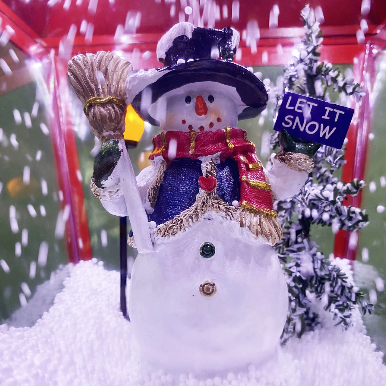 - Faux snow cascades over a snowman scene in one lantern and a Christmas tree scene in the other lantern