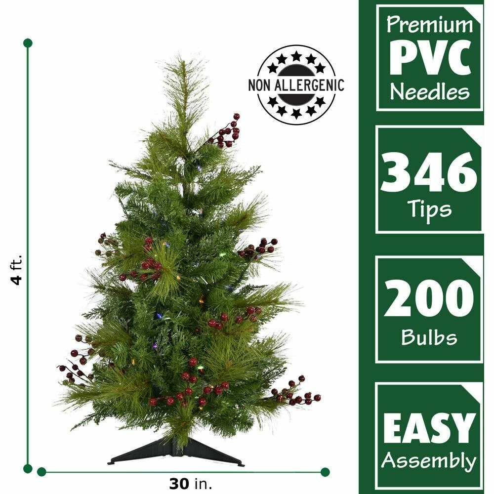 The 4-ft. Newberry Pine Artificial Tree Set, from Fraser Hill Farm, features lifelike foliage and all-metal hinged branch construction. Fraser Hill Farm produces the most realistic trees in the market, featuring all the long-term benefits that come with owning an artificial tree. Imagine never having to shop, chop and pay for another natural tree again. The Newberry Pine tree simply unfolds out of storage and is ready to bring seasonal enchantment to your home. This set is pre-strung with LED lighting, a system of 200 long-lasting, evenly distributed bulbs. The tree needles are constructed out of non-allergenic and flame-retardant materials then painted multiple hues of green to produce a beautiful frosted effect. These details create the look of a natural tree without all the fuss and maintenance. Designed to last, this Newberry Pine tree set is sure to provide more convenience and ease to your holiday season, year after year.
