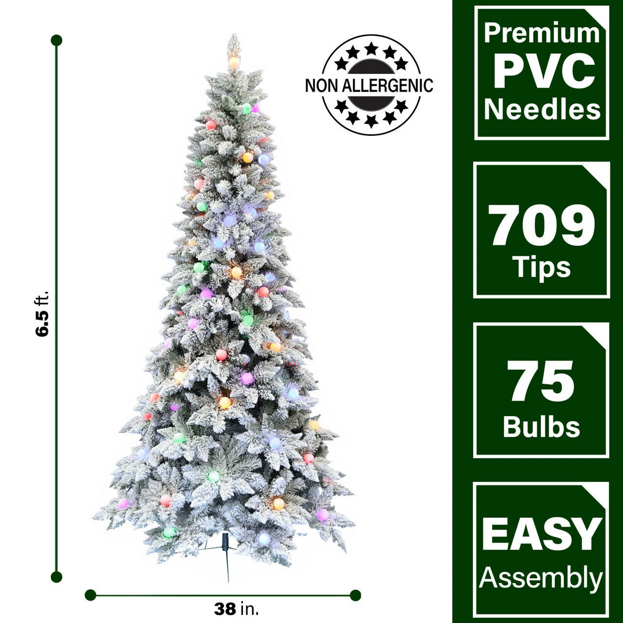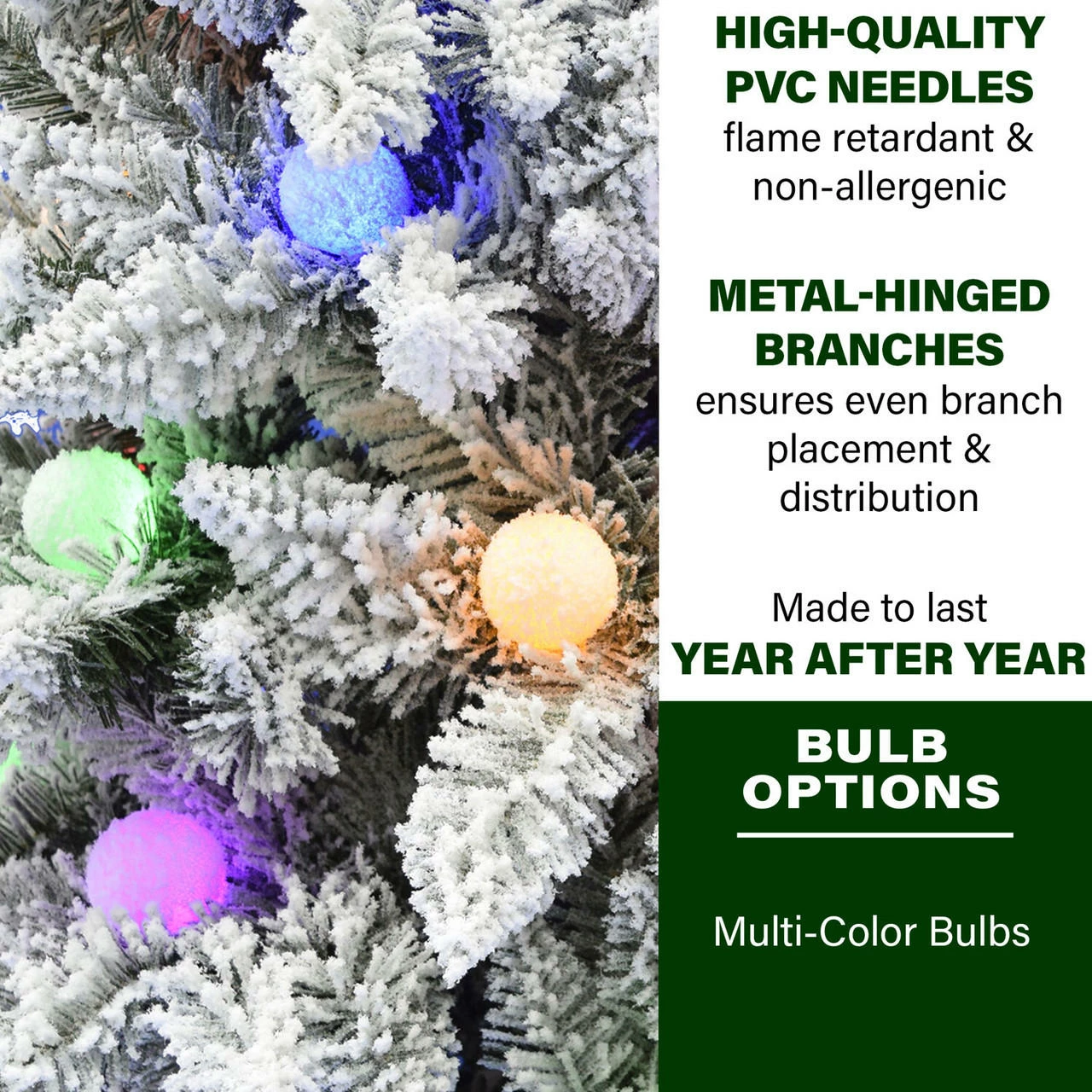 Step into the holiday season with this Slim White Tail Pine artificial Christmas tree from Fraser Hill Farm. This beautiful pine tree features a slim, natural-shaped silhouette with lifelike snow-flocked foliage and all-metal hinged branch construction. The tree needles are crafted from non-allergenic and flame-retardant materials. Fraser Hill Farm produces the most realistic trees on the market, featuring all the long-term benefits of owning an artificial tree. Imagine never having to shop, chop, and pay for another needle-dropping natural tree again. Simply unfold out of storage, fluff, and decorate – leaving your old tangled string lights behind. This model is prestrung with 75 multi-colored vintage style G40 LED bulbs to illuminate any room’s focal point. Designed to last, the Slim White Tail Pine snow-flocked Christmas tree provides style and convenience year after year.