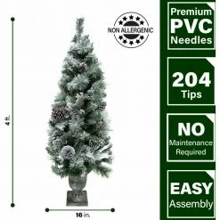Fraser Hill Farm Set Of 2, 4-Ft. Christmas Snow Flocked Porch Trees W/ Oversized Pinecones