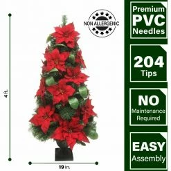 Fraser Hill Farm Set Of 2, 4-Ft. Christmas Porch Trees, Velvet Poinsettia Blooms, Leaf Accents