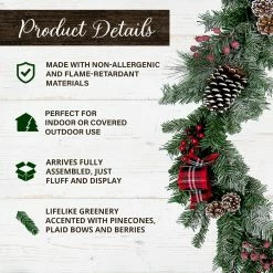 Fraser Hill Farm 6-Ft. Christmas Lightly Frosted Garland W/ Pinecones, Berries, And Plaid Bows